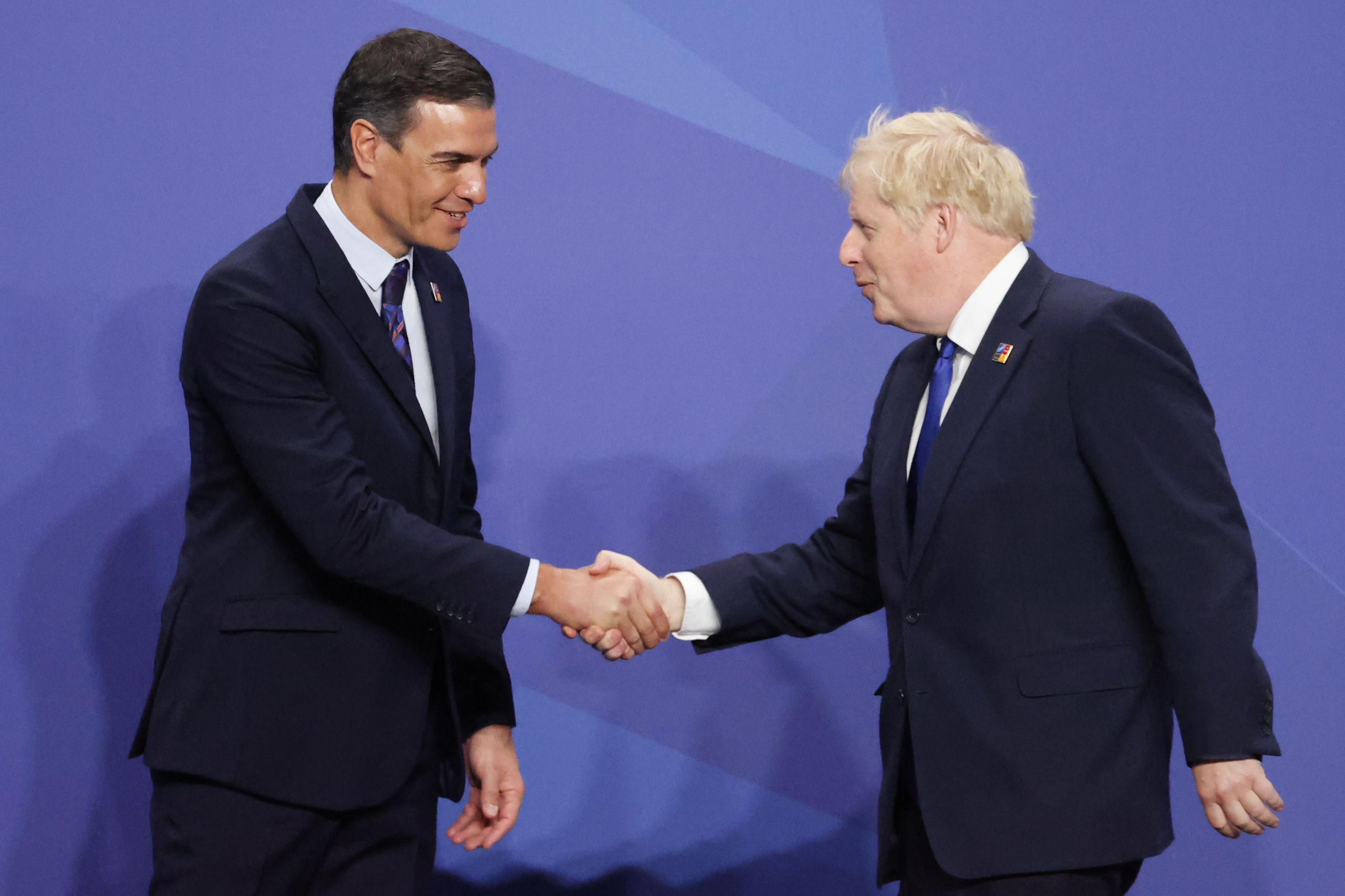 El presidente del Gobierno, Pedro Sánchez (i), saluda al primer ministro del Reino Unido, Boris Johnson (d) antes de posar para la foto oficial durante la primera jornada de la cumbre de la OTAN que se celebra este miércoles en el recinto de Ifema, en Madrid.