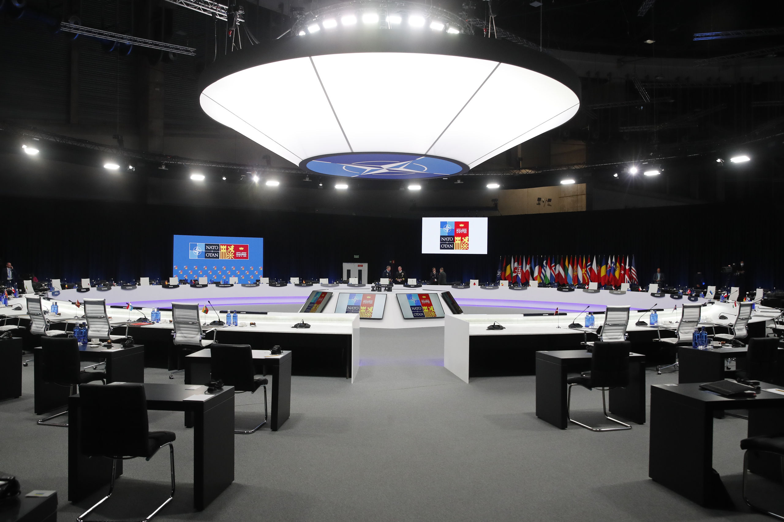 Vista general de la mesa de reuniones de la primera jornada de la cumbre de la OTAN que se celebra en el recinto de Ifema, en Madrid.