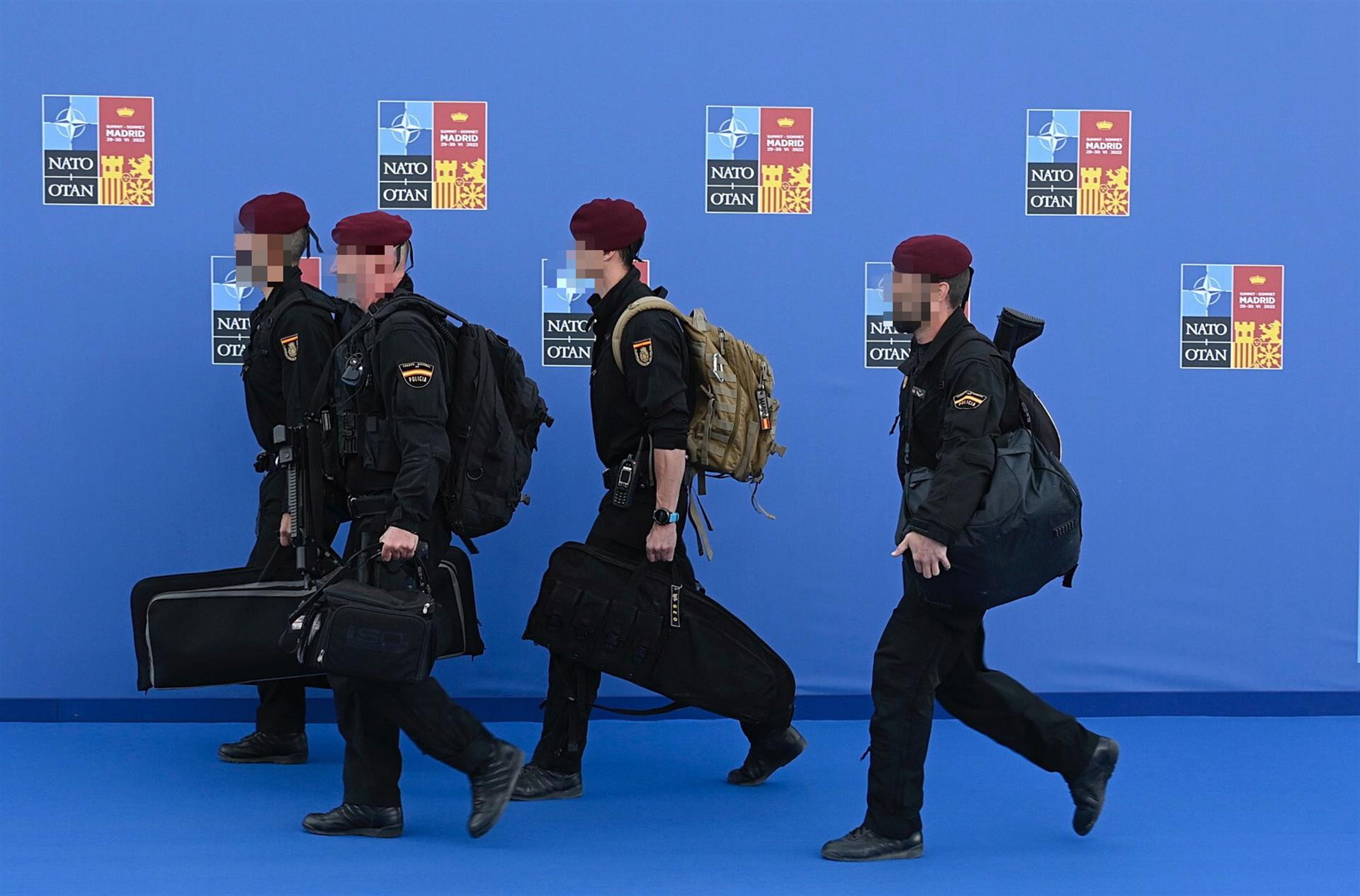Miembros de la policía nacional a su llegada a la primera jornada de la cumbre de la OTAN en el pabellón de Ifema en Madrid este miércoles. EFE/ Fernando Villar