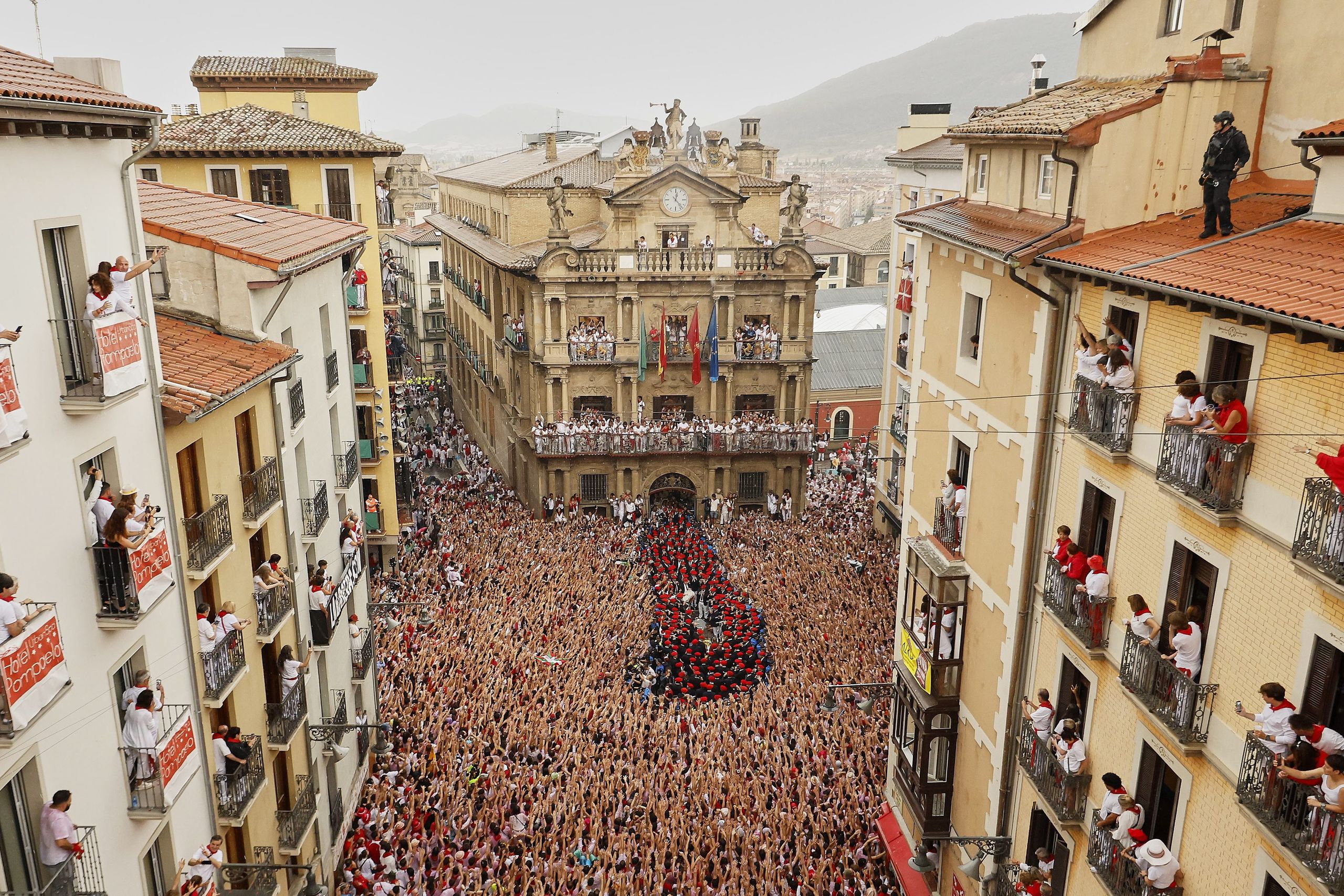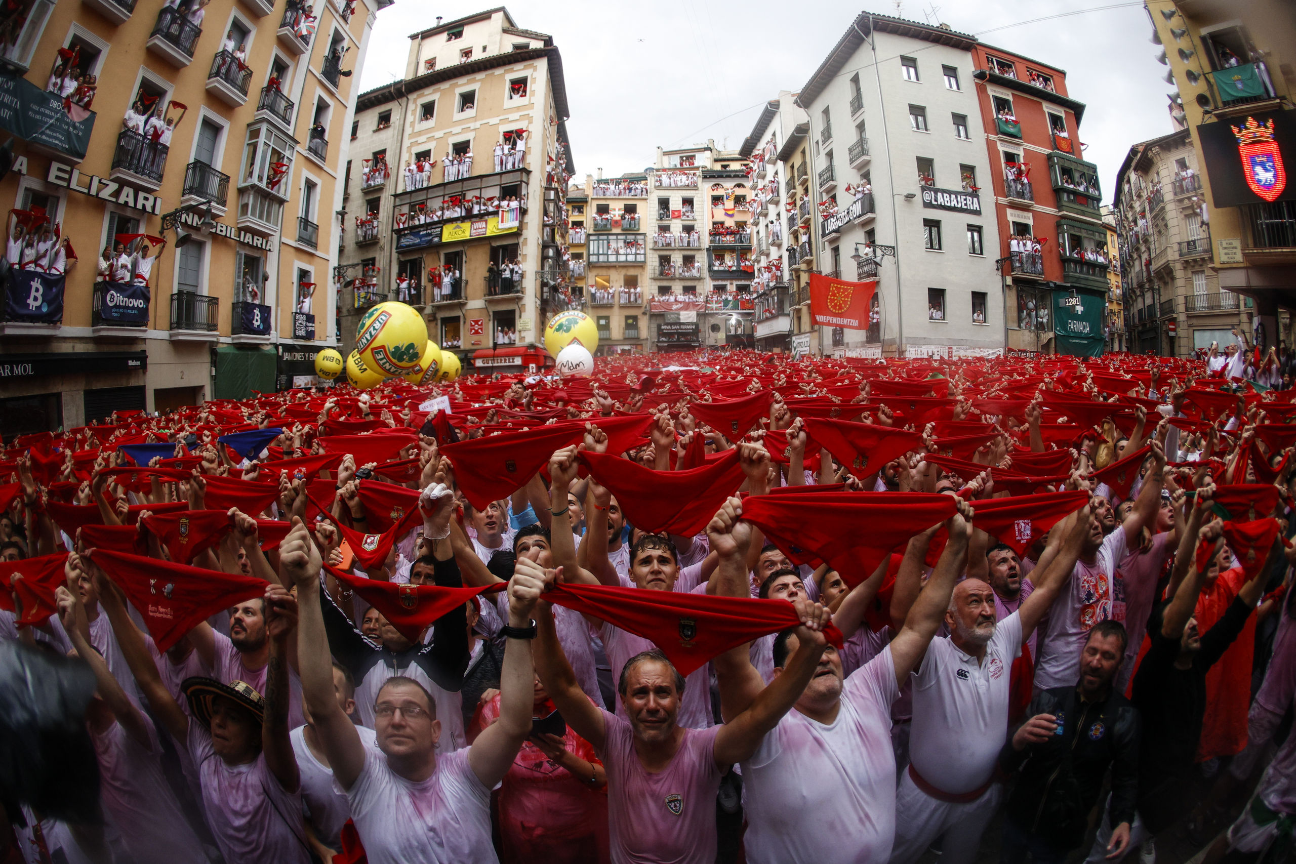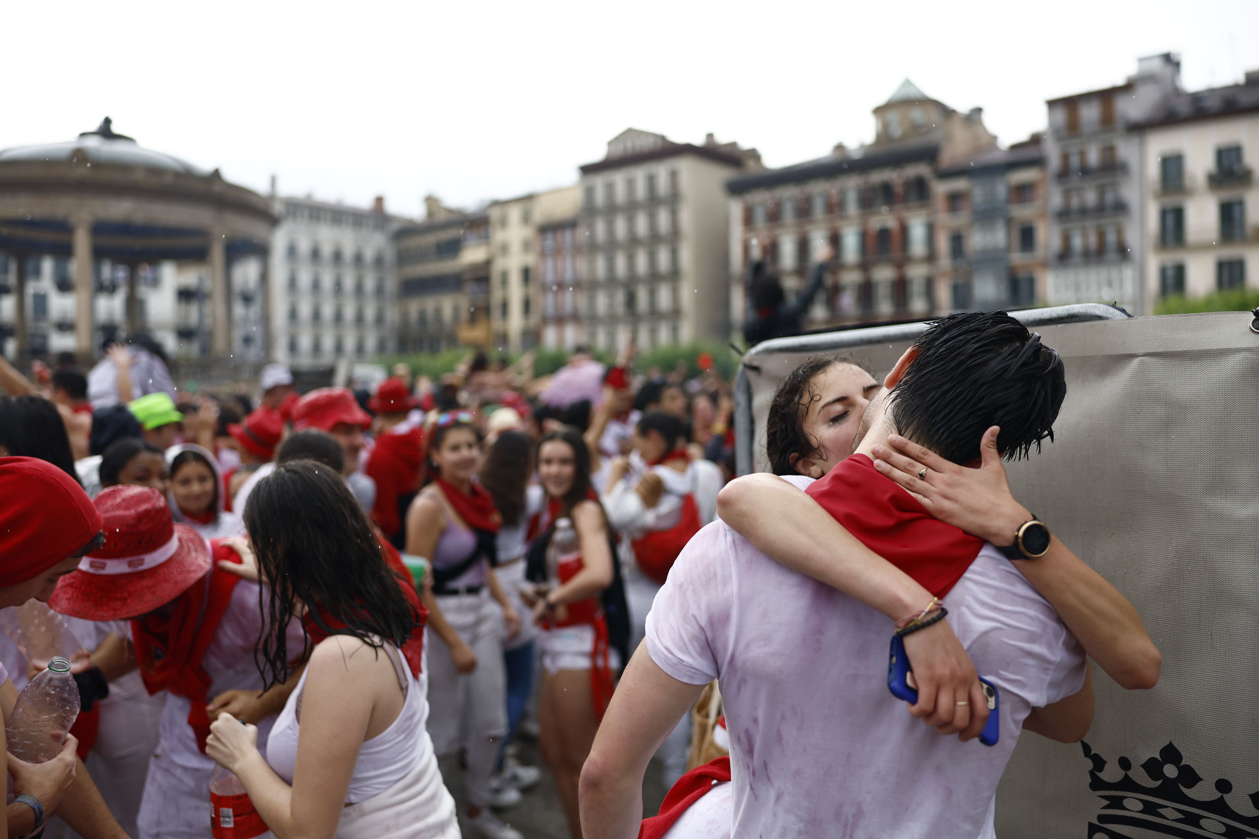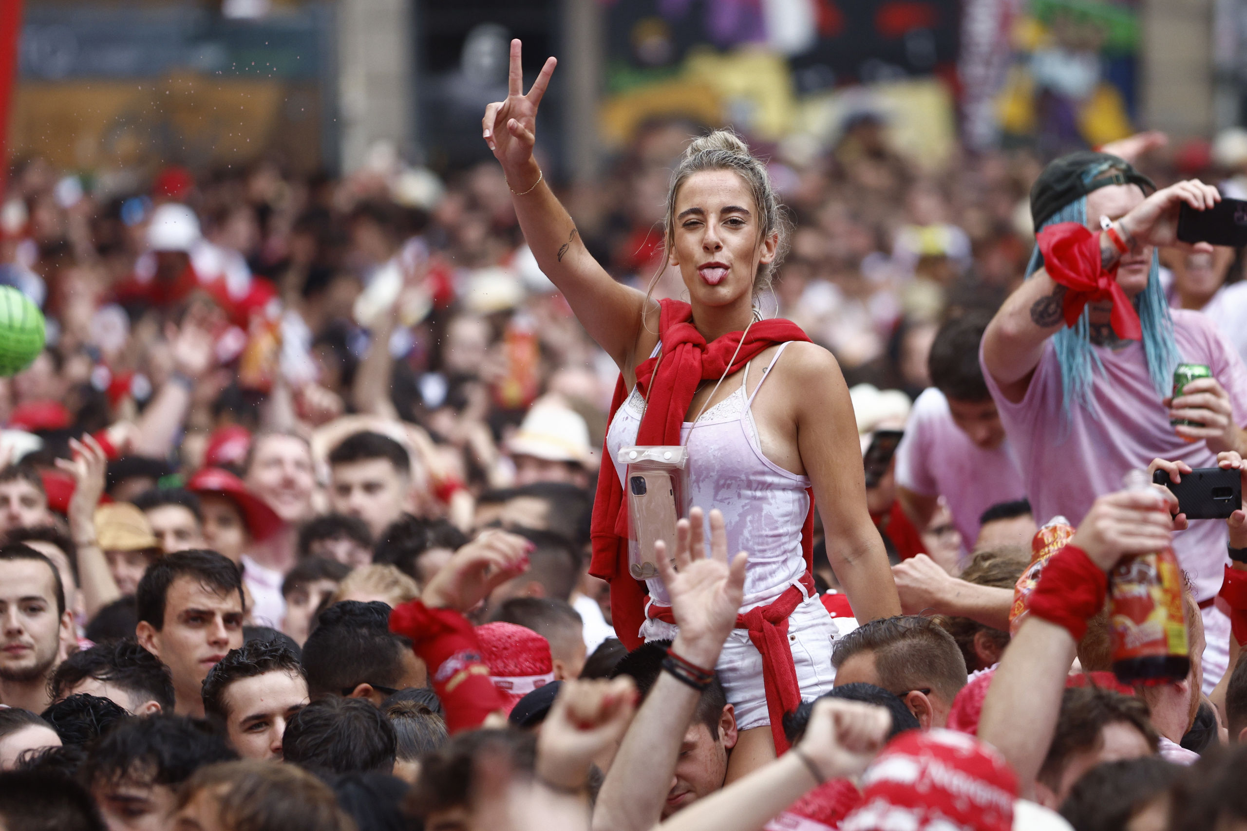 Los mozos han repetido el 'viva' y el 'gora' y tras el estallido del chupinazo se han ido anudando el pañuelo al cuello y han disfrutado de la alegría y de la música en los primeros compases de la fiesta para dar comienzo a 204 horas de Sanfermines que finalizarán el próximo 14 de julio con el Pobre de mí.