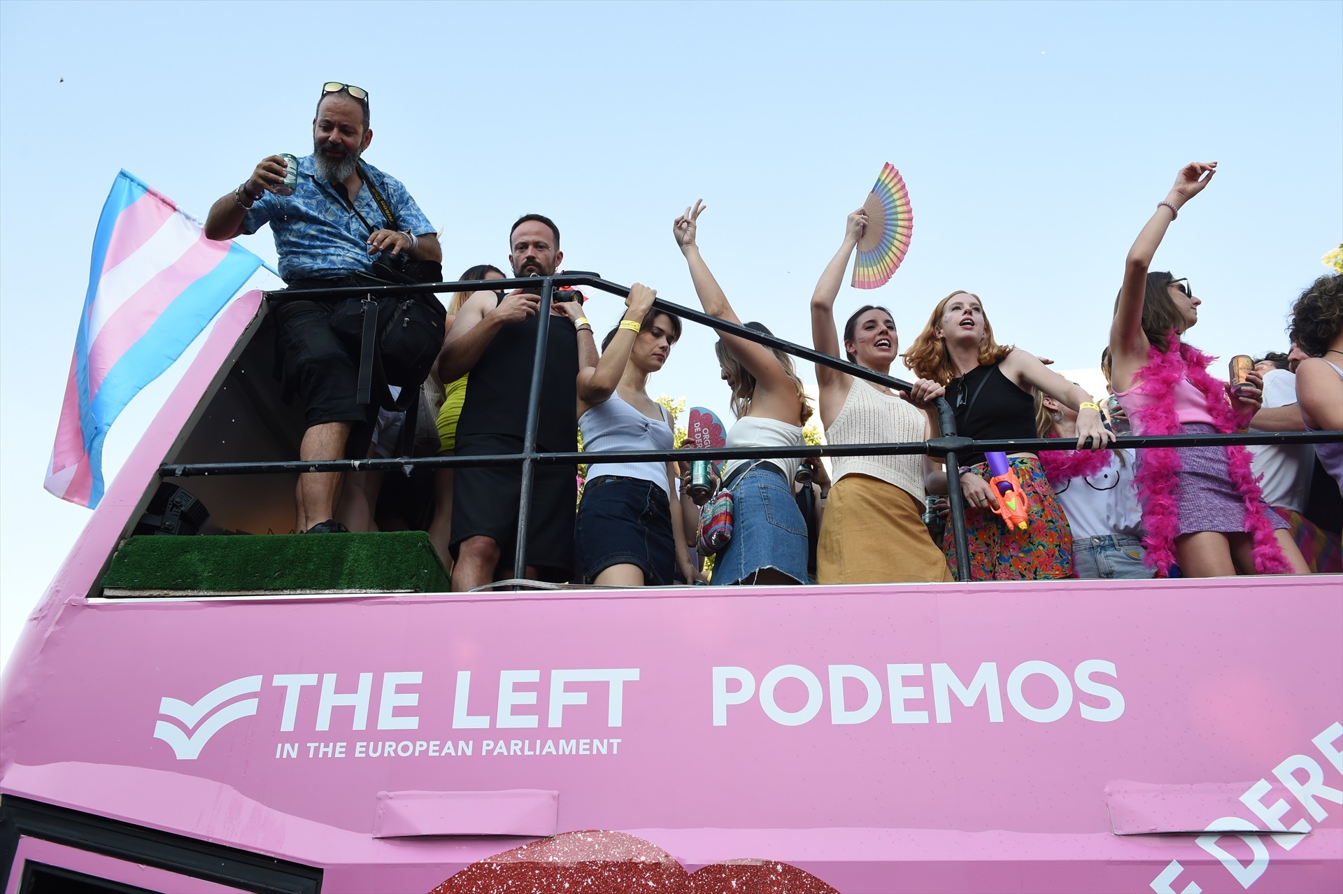 Irene Montero, Isa Serra y Lilith Verstrynge disfrutan de la manifestación del Orgullo 2022 de Madrid desde la carroza de Podemos.