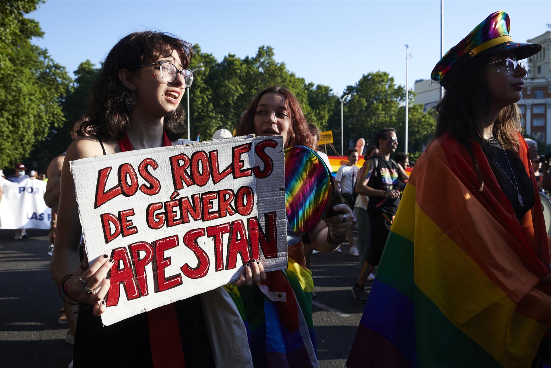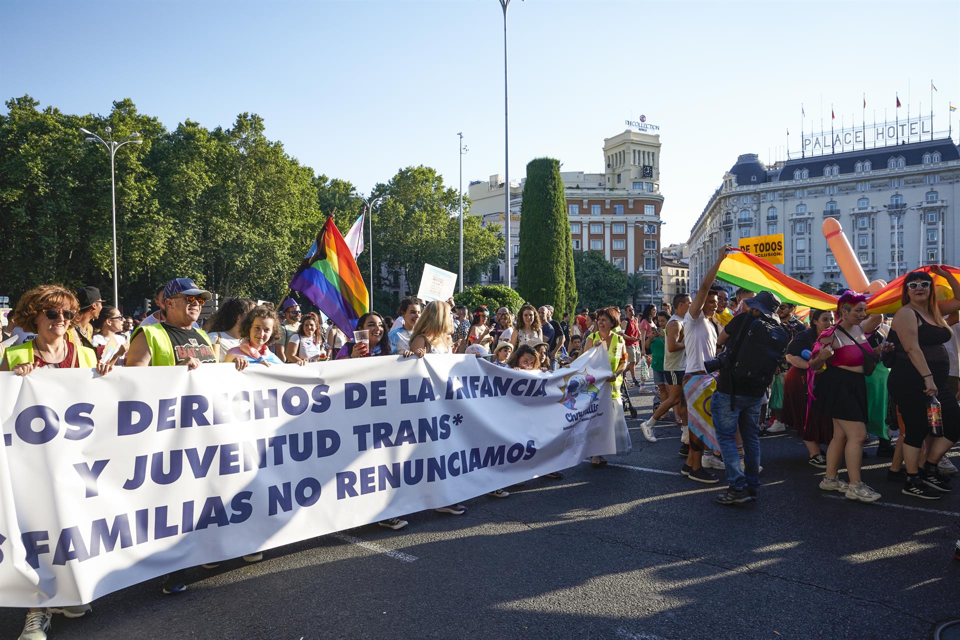 Participantes en la manifestación del Orgullo 2022 en Madrid portan una pancarta alusiva a los derechos de la infancia y juventud trans.
