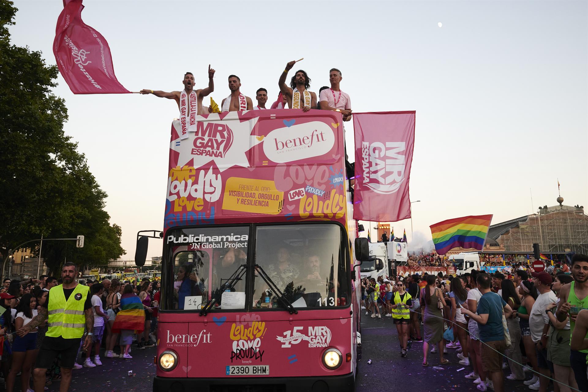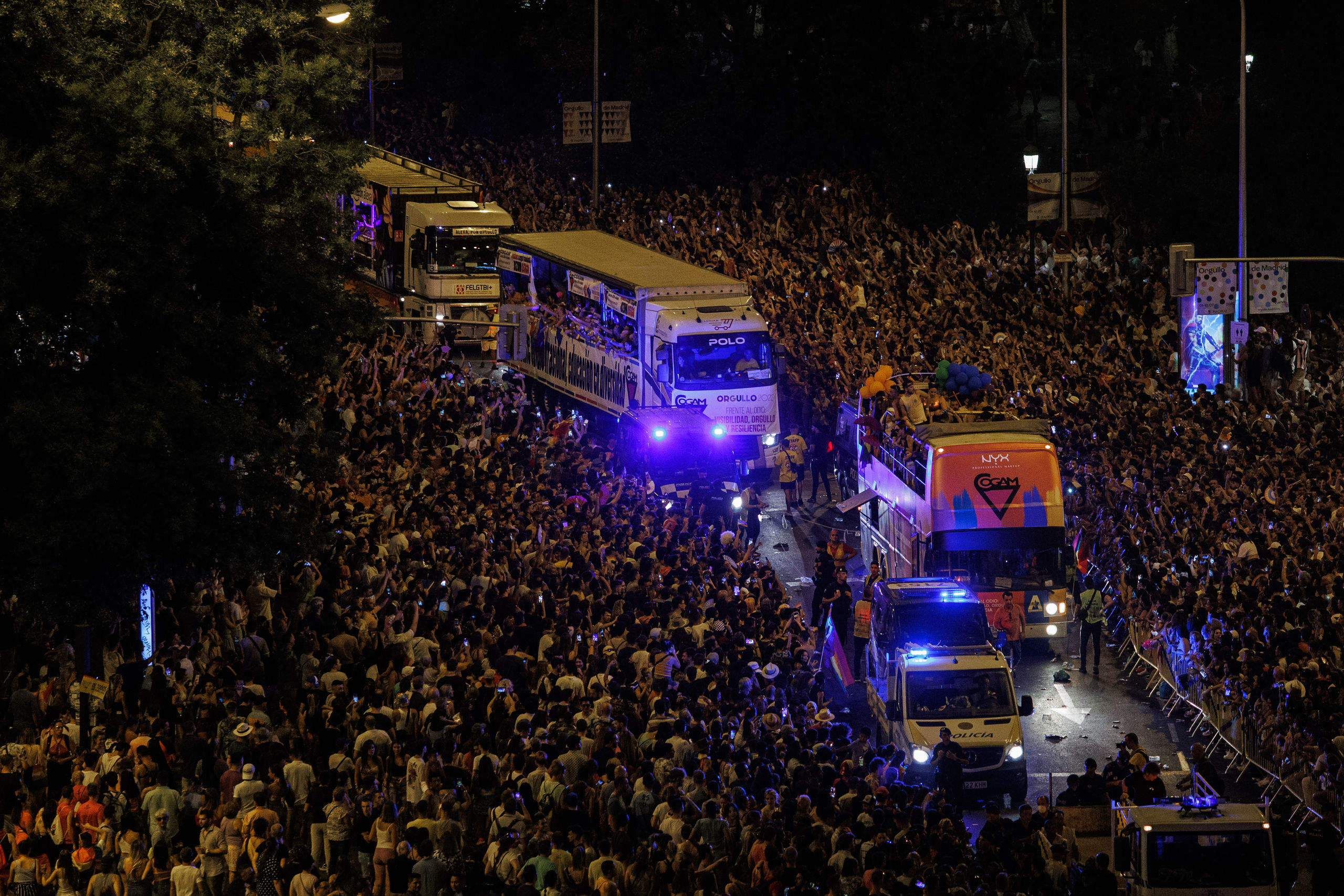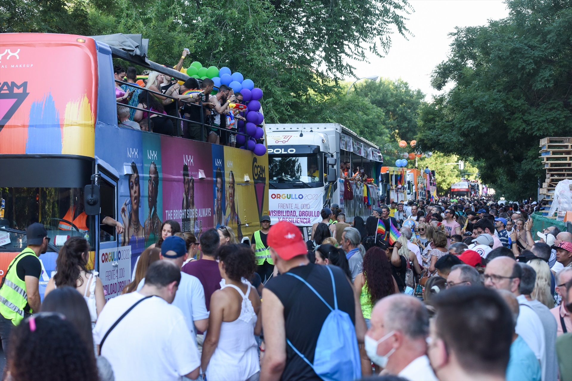Varias carrozas circulan entre la multitud en la manifestación del Orgullo 2022 en Madrid.