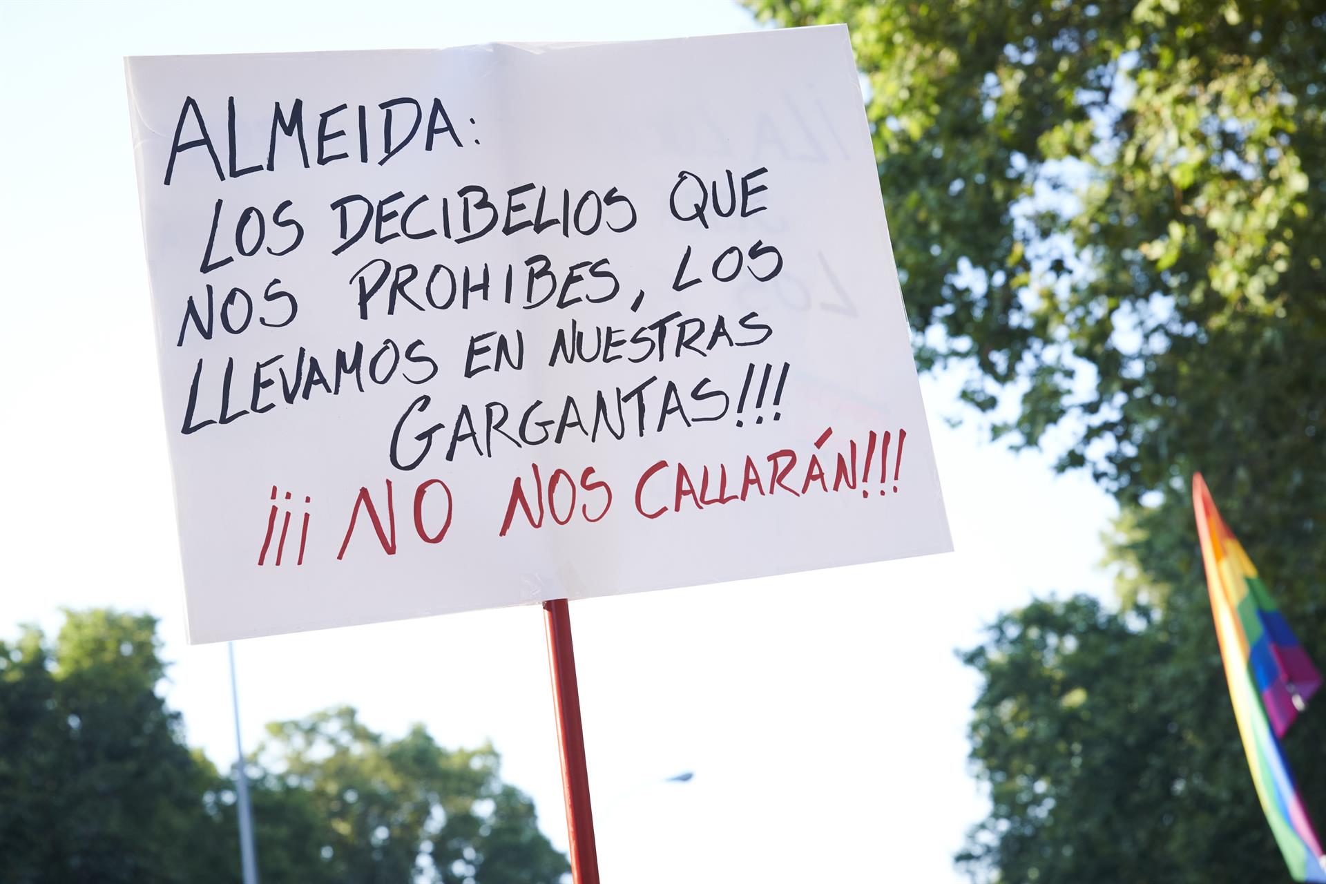 Un cartel contra el alcalde de Madrid, José Luis Martínez Almeida, en la manifestación del Orgullo 2022 que recorre las calles de la capital.