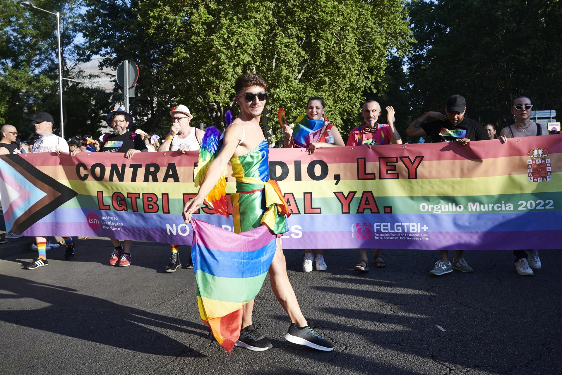 Un participante envuelto en la bandera LGTBI en la manifestación del Orgullo 2022 en Madrid.