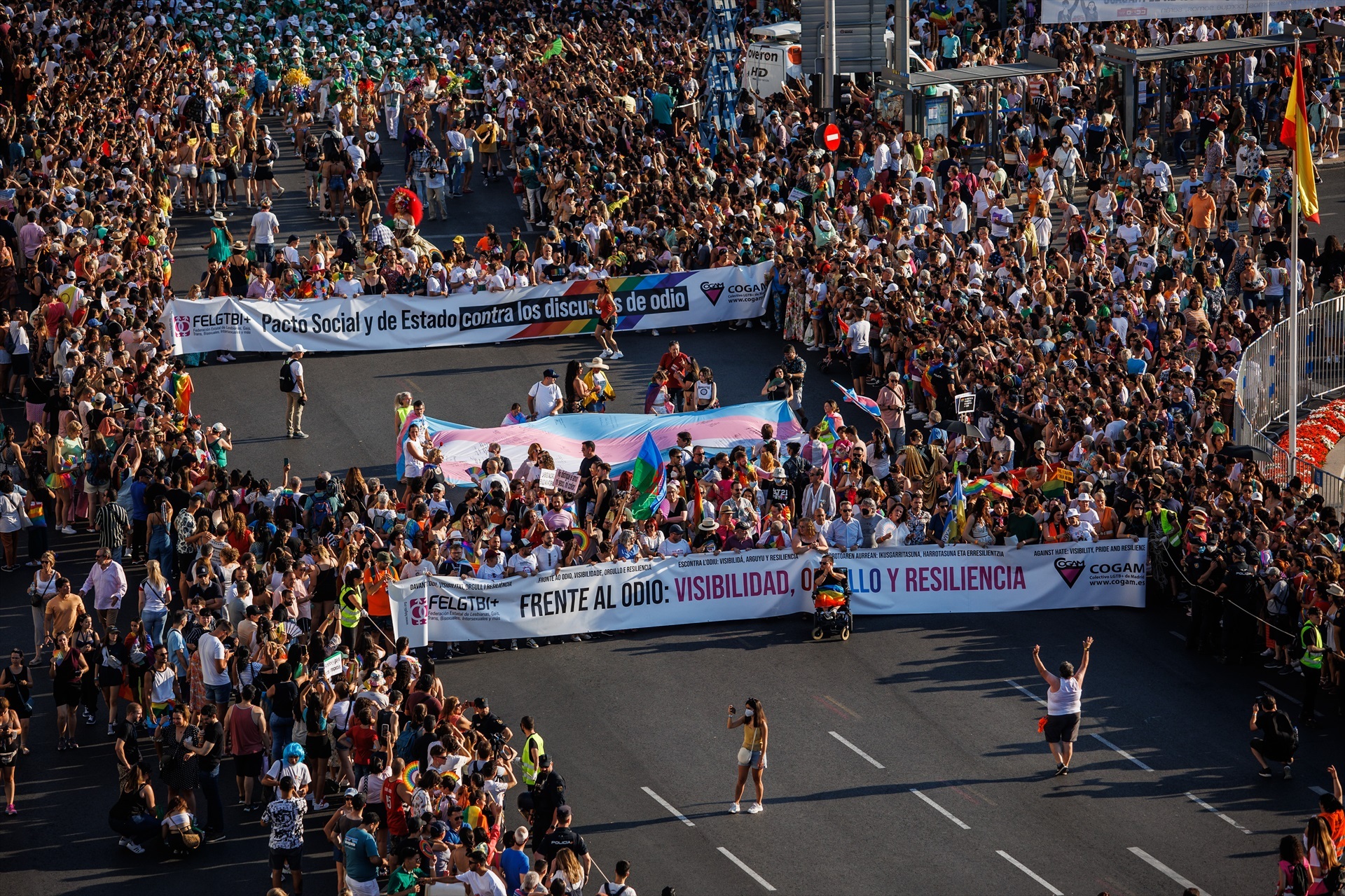 Asistentes a la manifestación del Orgullo en Madrid el 9 de julio de 2022. La marcha ha sido organizada por COGAM y FELGTB, y transcurre en un ambiente festivo y reivindicativo.