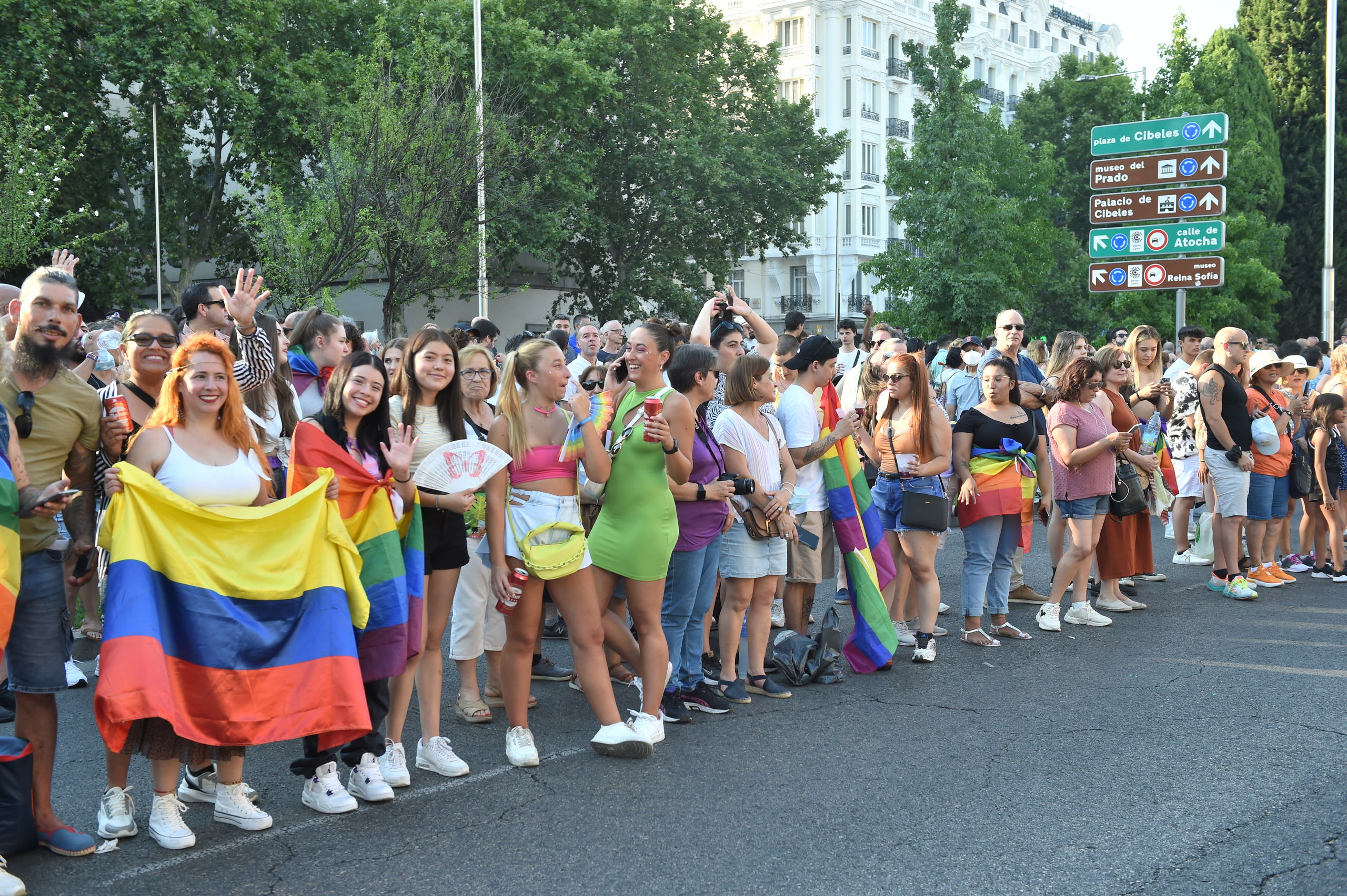 Miles de personas celebran el día del Orgullo LGTBI en un ambiente festivo en Madrid.