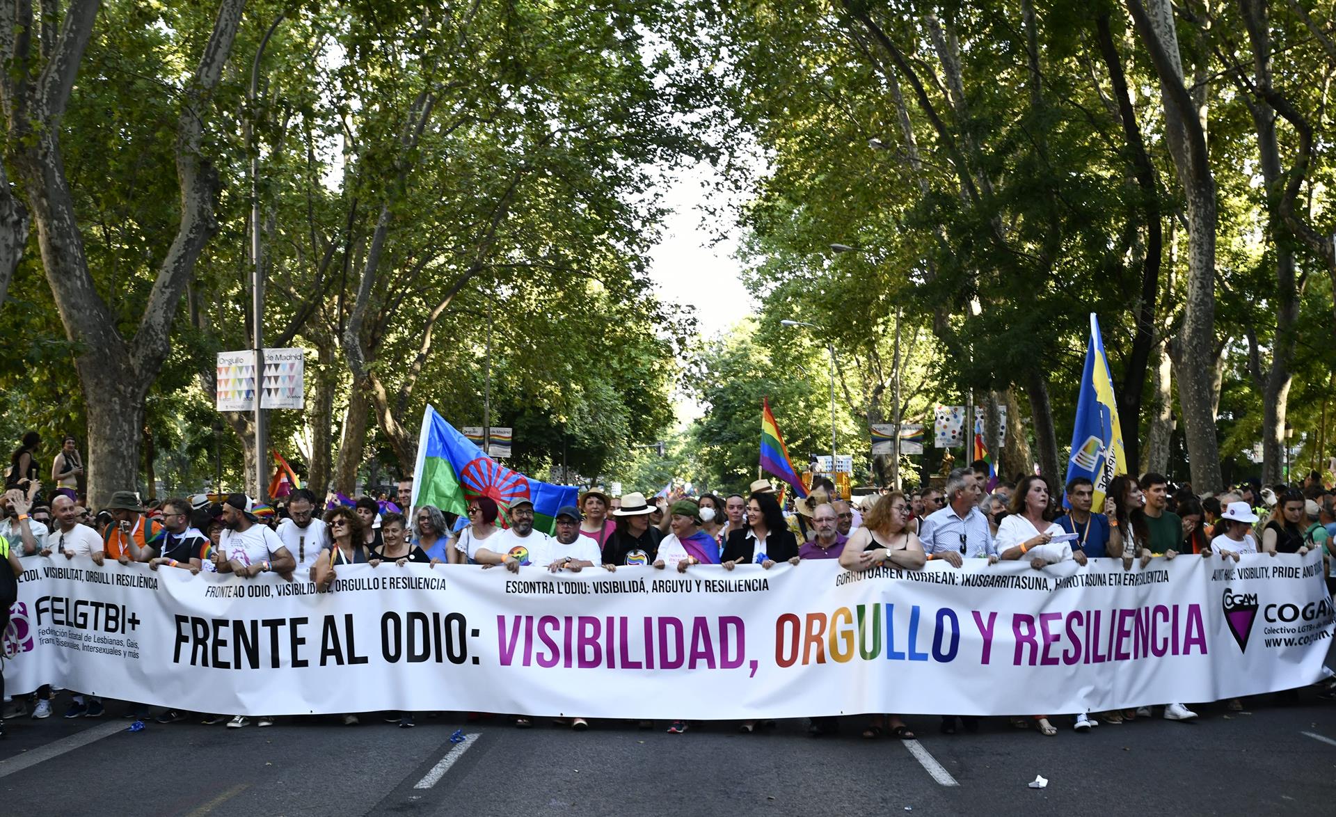Participantes de la manifestación del Orgullo 2022 en Madrid portan la pancarta con el lema "Frente al odio: Visibilidad, Orgullo y Resiliencia".