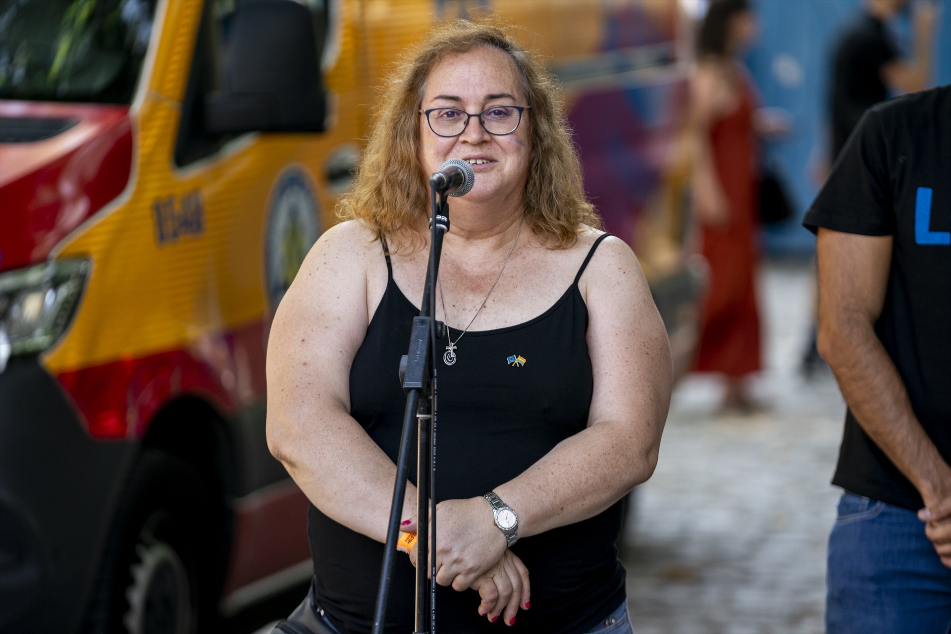 La presidenta de COGAM, Carmen García de Merlo, habla antes de comenzar la manifestación del Orgullo 2022 en Madrid.