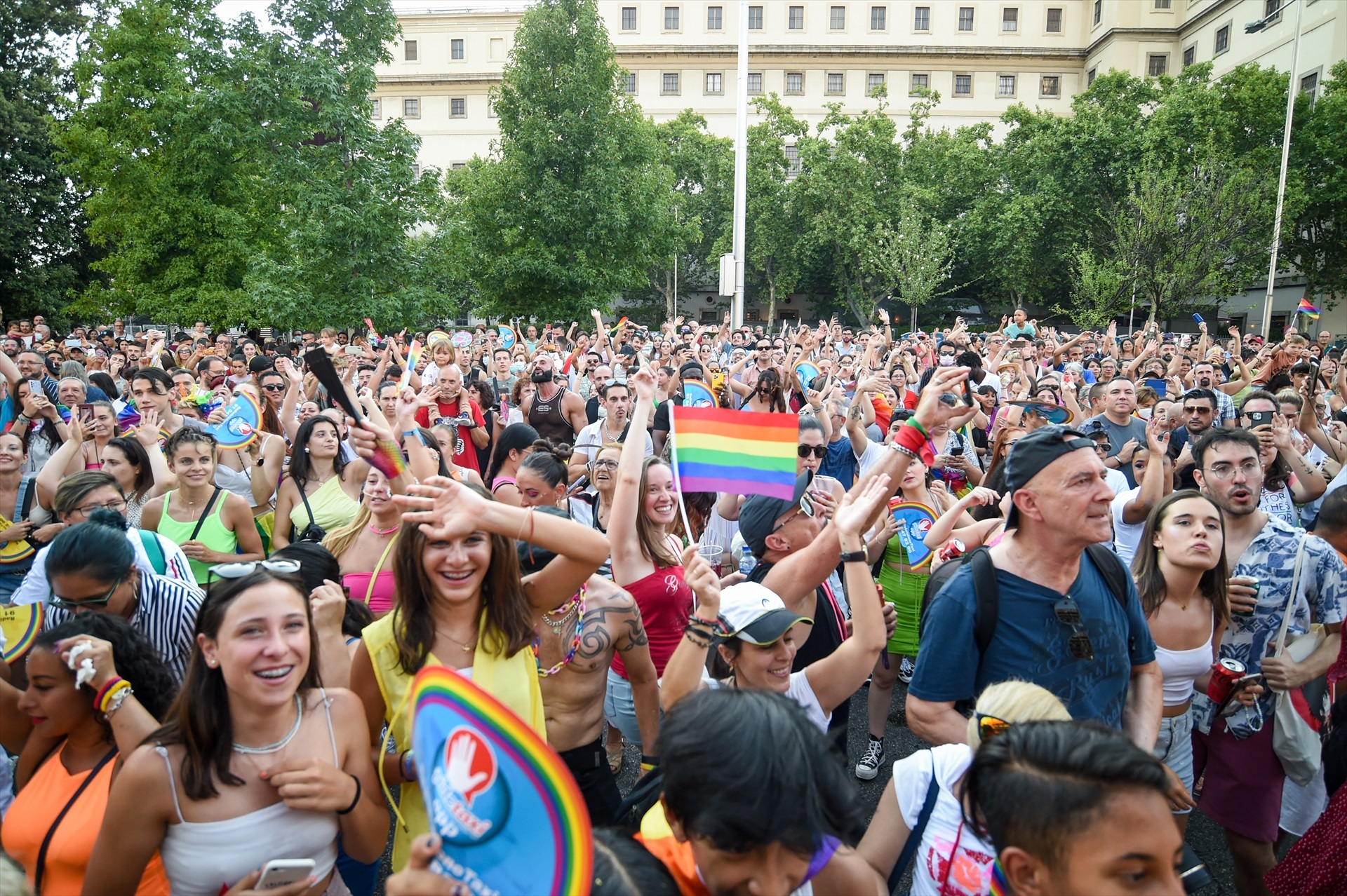 Asistentes a la manifestación del Orgullo 2022 en Madrid, minutos antes de iniciar la marcha. El acto se celebra bajo el lema “Frente al odio: Visibilidad, Orgullo y Resiliencia”.