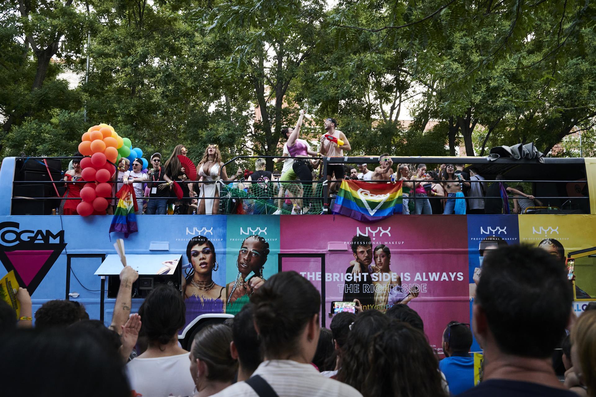 Una colorida carroza participando en la manifestación del Orgullo 2022 en Madrid.
