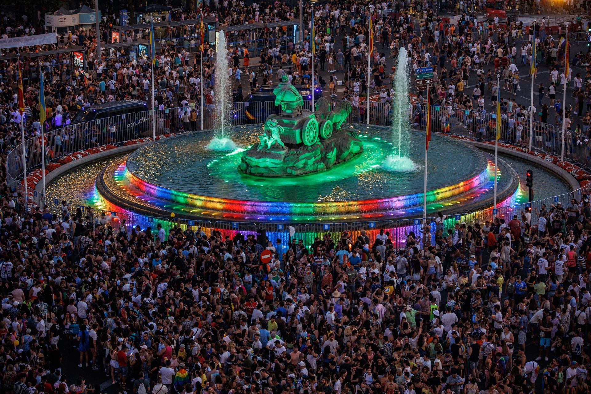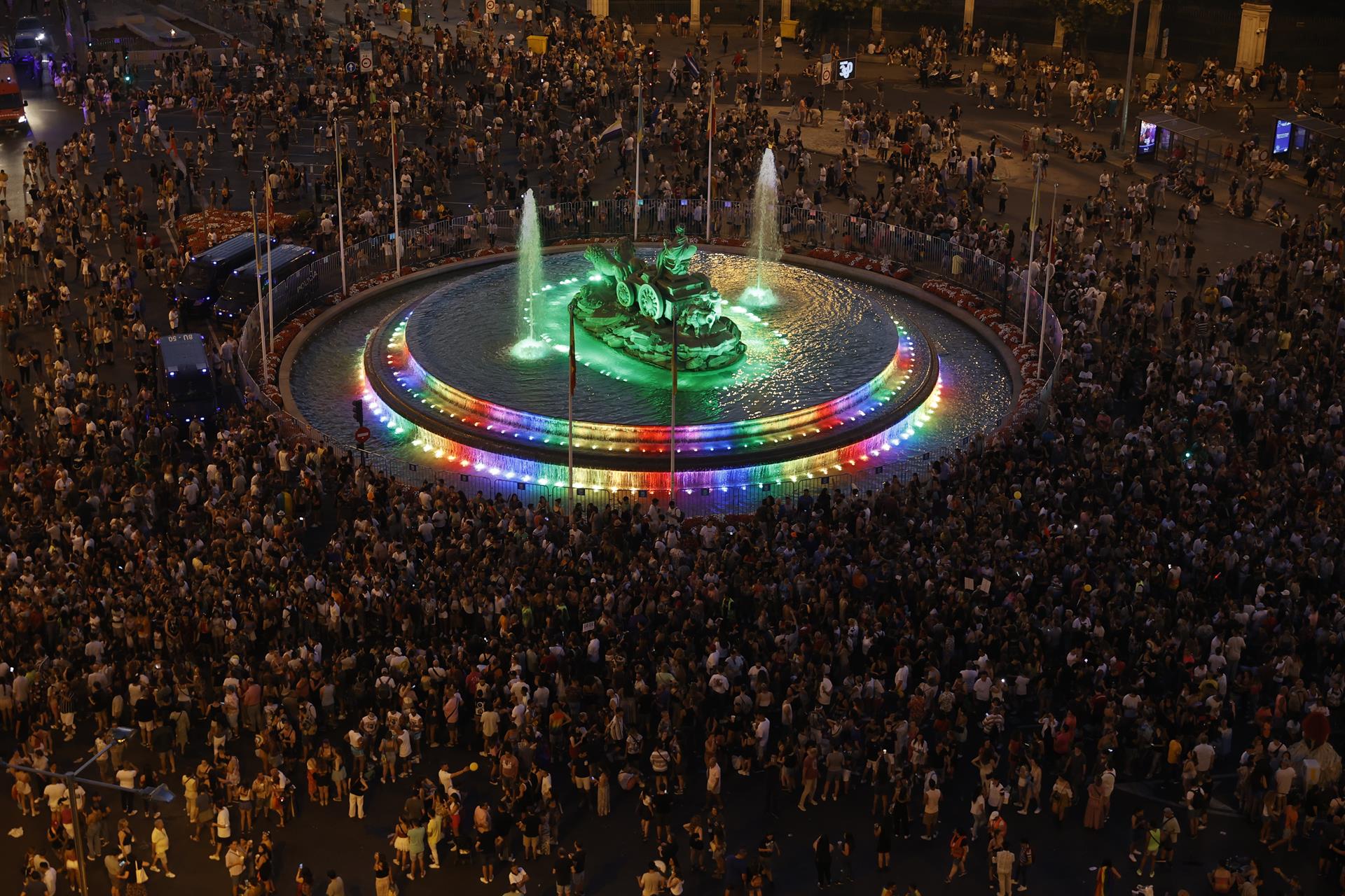 La fuente de Cibeles en Madrid iluminada con los colores de la bandera LGTBI con motivo de la celebración del Orgullo 2022.