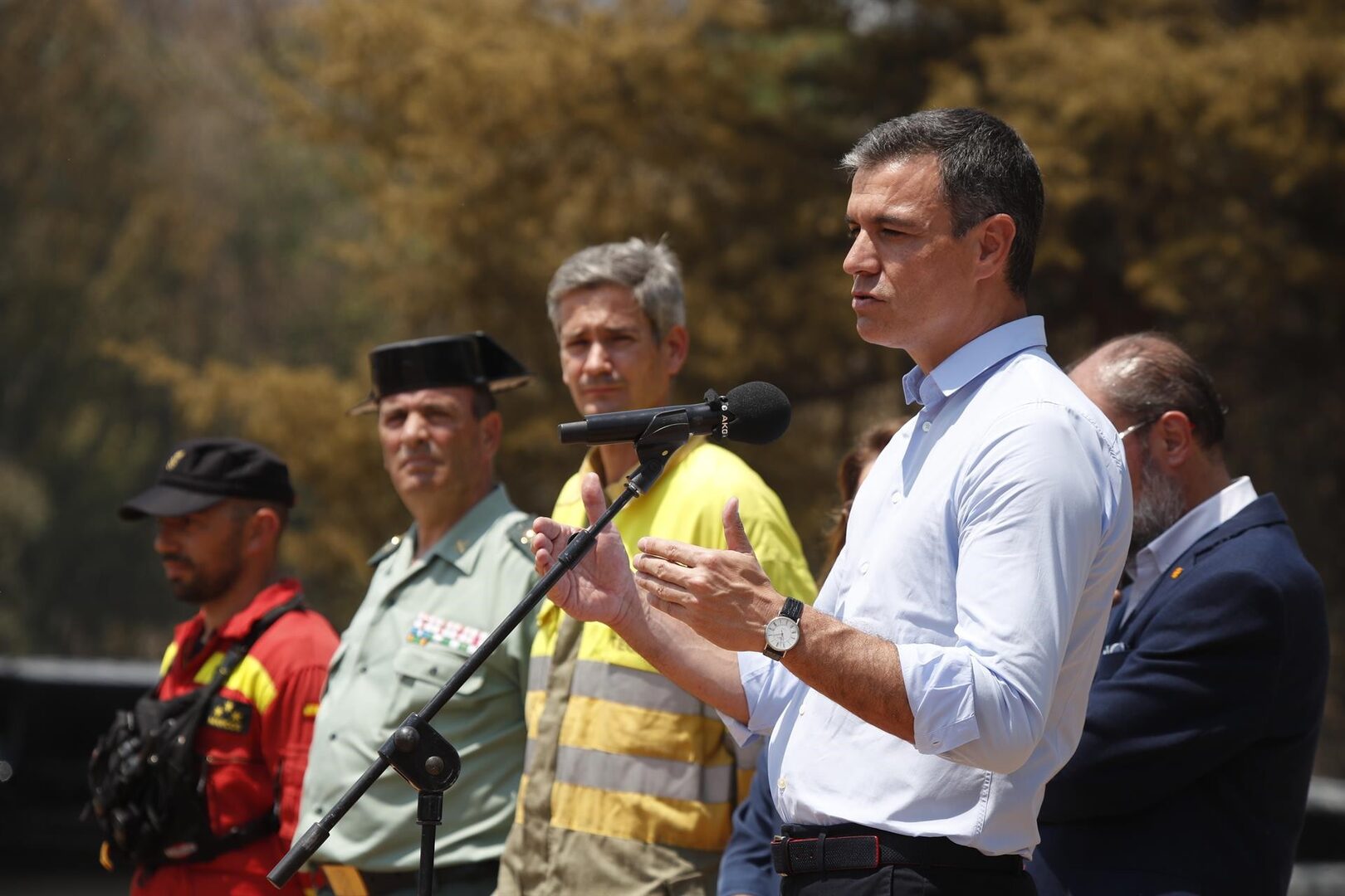 El presidente del Gobierno, Pedro Sánchez, ha tenido este miércoles su tercera jornada consecutiva de visitas a los puestos de mando avanzados donde los servicios de extinción luchan contra los incendios que asolan a buena parte de la geografía española. Esta vez su destino era Ateca, una pequeña localidad de Zaragoza, aunque antes se ha desplazado a Castellón a inaugurar un nuevo tramo de carretera junto al presidente valenciano, Ximo Puig.