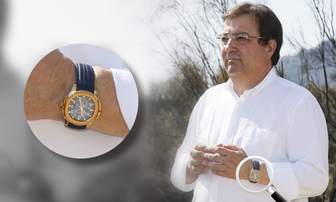 Una foto de Guillermo Fernández Vara al Parque Nacional de Monfragüe, arrasado por uno de los violentos incendios que estos días asolan la Península Ibérica, desató la polémica en redes sociales cuando un tuitero experto en relojes, Santiago Tejedor, puso el foco en el reloj que portaba el presidente de Extremadura. A saber: un carísimo Patek Phillipe Aquanaut Travel Time, con un precio de venta al público de 55.000 euros.