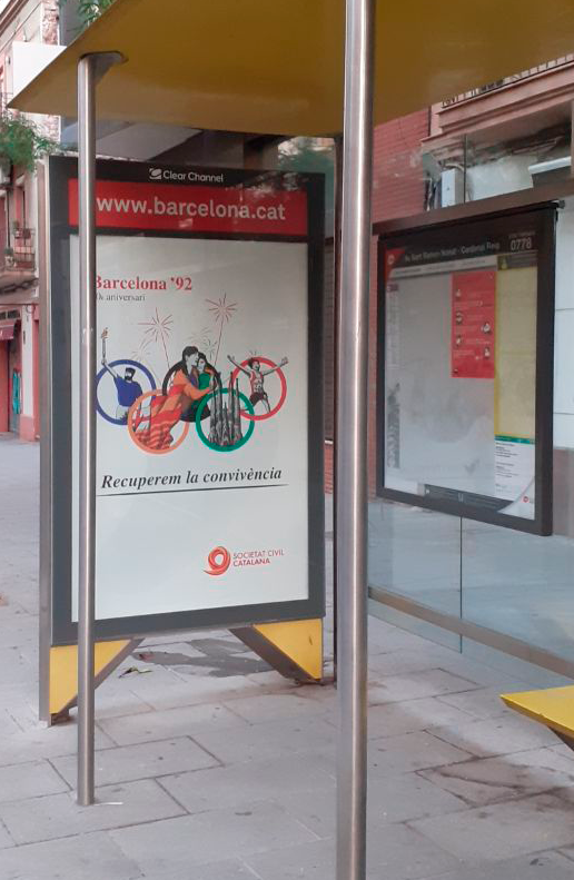 "Recuperemos la convivencia" es el eslogan de los carteles editados por la entidad constitucionalista Sociedad Civil Catalana (SCC) para recordar el trigésimo aniversario de los Juegos Olímpicos de Barcelona. La publicidad luce en las marquesinas de las paradas de autobuses de la ciudad que acogió con gran éxito el acontecimiento deportivo, pero no así en el Metro, donde ha sido vetada porque según Transportes Metropolitanos de Barcelona (TMB), la campaña "no se ajusta a las tipologías de campañas publicitarias contempladas en su normativa".