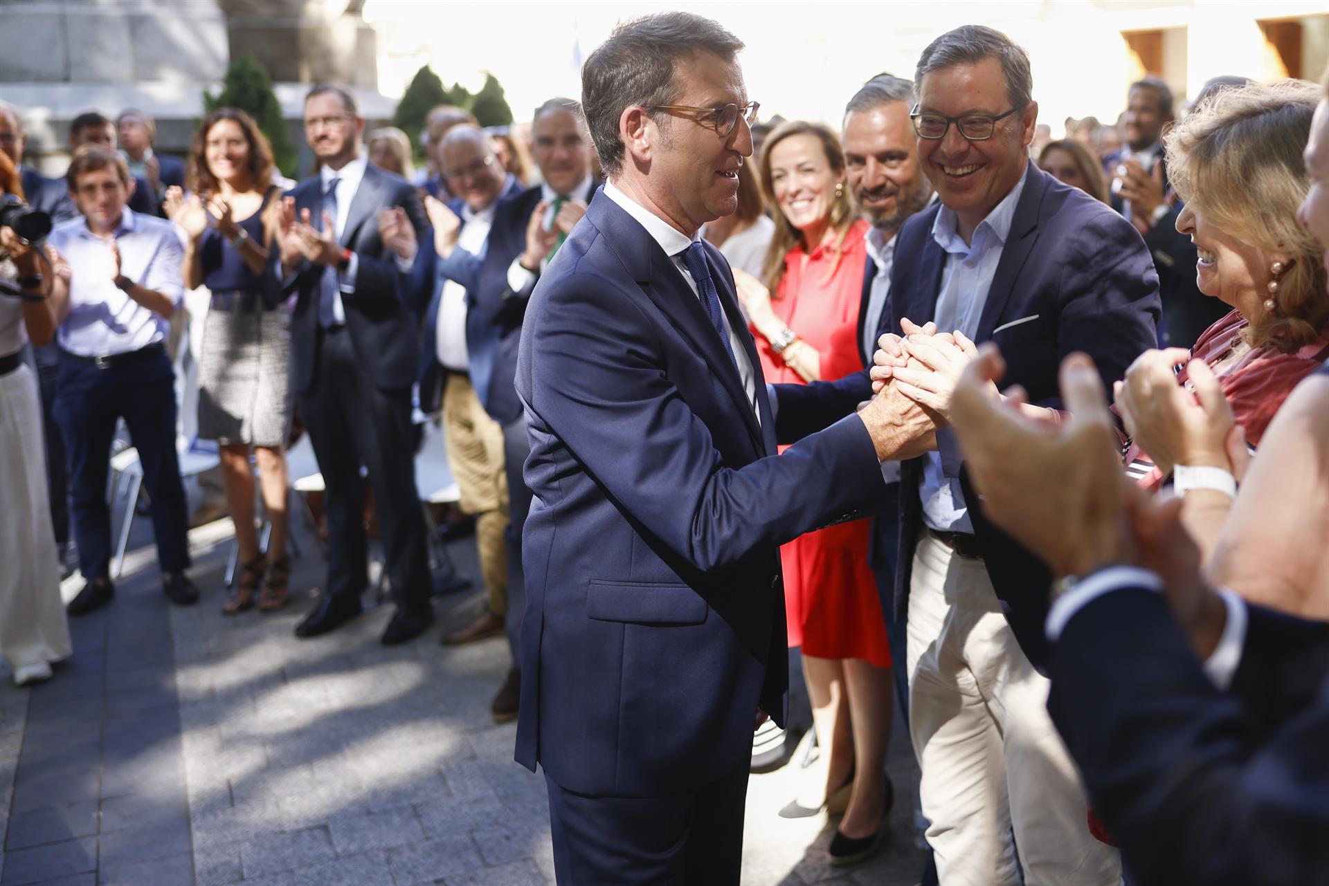 Junto al Senado, en la madrileña Plaza de la Marina Española, el líder del Partido Popular ha realizado este jueves por la mañana su balance del curso político. Acompañado por la dirección de su formación, diputados y senadores, Alberto Núñez Feijóo ha comenzado su discurso reconociendo que para el PP ha sido un "curso complejo" por la crisis que a principios de año acabó con la cúpula de Pablo Casado.
