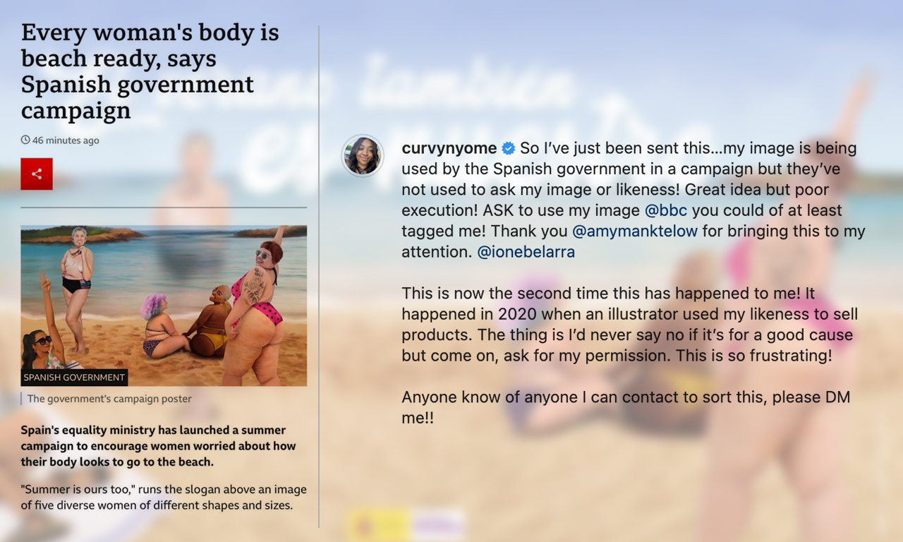 La modelo británica de tallas grandes Nyome Nicholas-Williams ha denunciado públicamente que el Ministerio de Igualdad ha utilizado una imagen suya sin su permiso. "Mi imagen está siendo utilizada por el Gobierno español en una campaña, ¡pero no me han preguntado! ¡Gran idea, pero mala ejecución! Pedid usar mi imagen o al menos etiquetadme", ha lanzado la modelo curvy a través de su Instagram donde acumula casi 79.000 seguidores.