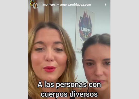 Sin mencionar el cartel, que aparece fugazmente al principio, Irene Montero y Ángela Rodríguez Pam se dirigen a las mujeres que han tenido "miedo" de enseñar el cuerpo porque se les había dicho "que había un cuerpo correcto", "a las que lo tienen gordo pero también muy delgado" y "a las que tienen pelos donde se supone que no deben tener ese pelo".