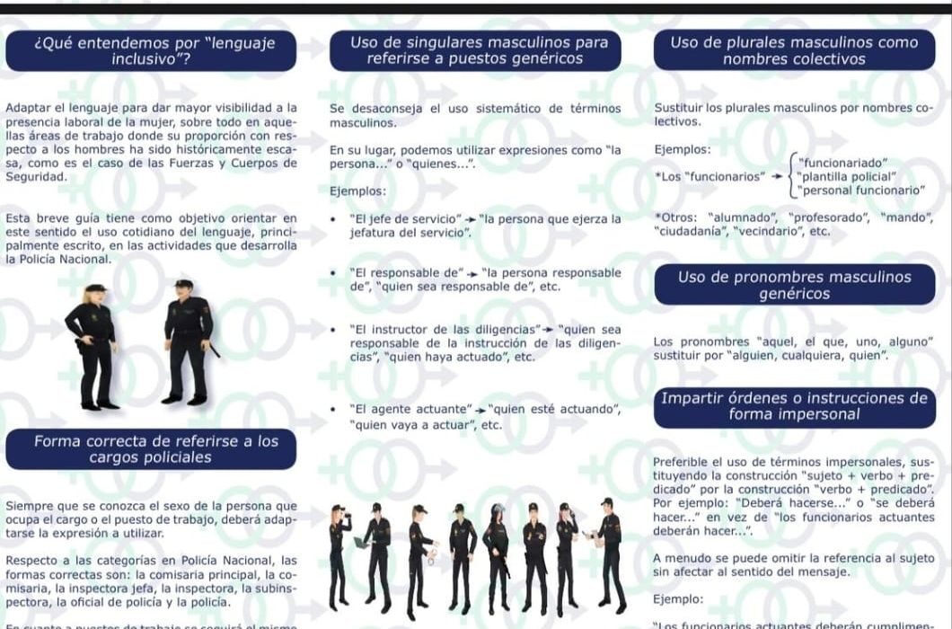 El Ministerio del Interior ha exigido a los agentes de Policía Nacional, por medio de una guía, que "adapten el lenguaje para dar mayor visibilidad a la presencia laboral de la mujer, sobre todo en aquellas áreas de trabajo donde su proporclón con respecto a los hombres ha sido históricamente escasa; como es eI caso de las Fuerzas y Cuerpos de Seguridad".