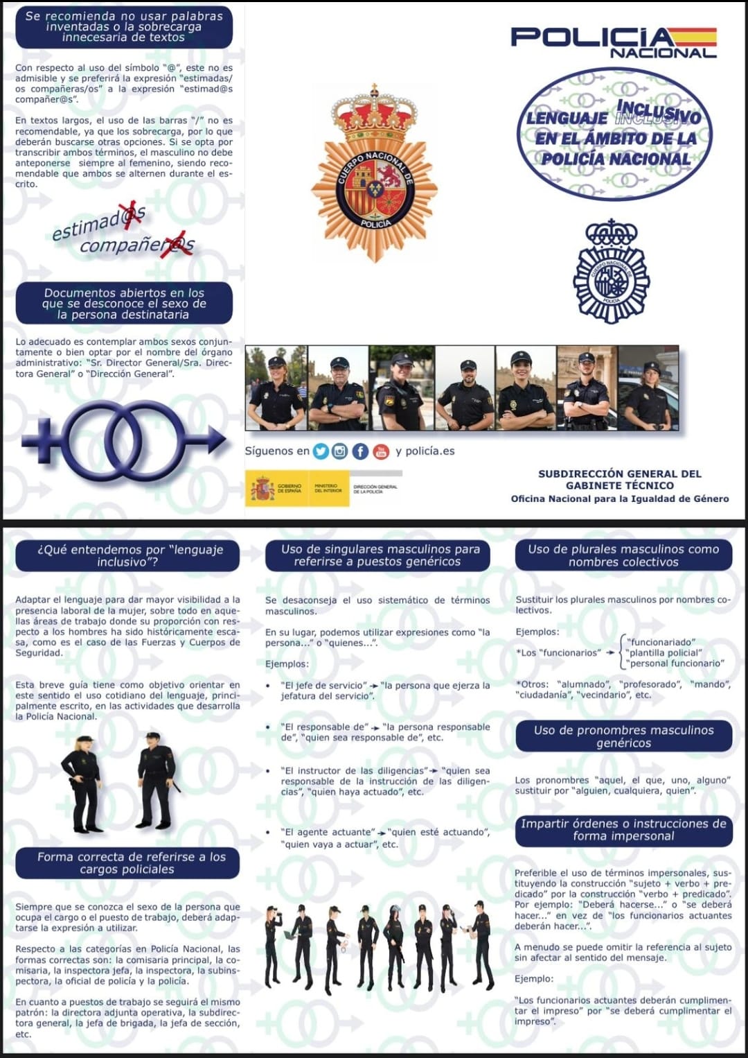 Las nuevas indicaciones a los policías son claras: "El uso del símbolo @ no es admisible y se preferirá la expresión "estimadas/os compañeras/os" a la expresión "estimados/as compañeros/as". Porque "el masculino no debe anteponerse siempre al femenino, siendo recomendable que ambos se alternen durante el escrito".
