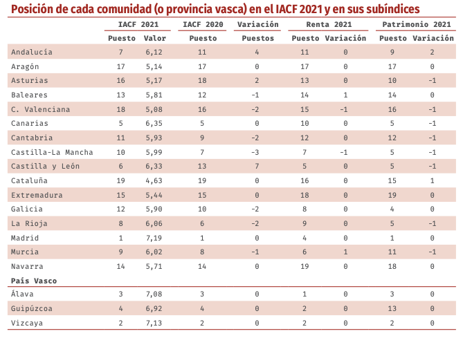 Pero si nos fijamos en otras variables, como el impuesto sobre la renta o el impuesto sobre patrimonio, Extremadura ocupaba el año pasado las dos peores posiciones de la tabla. La penúltima en renta (puesto 18) y la última en patrimonio (19).