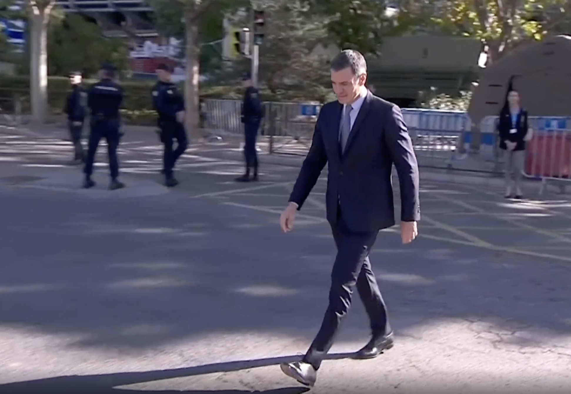 Tras varios minutos, Pedro Sánchez ha llegado a la zona, lo que ha permitido que don Felipe y doña Letizia pudiesen apearse del coche para ser recibidos por las autoridades. Y todo ello para que el presidente del Gobierno no haya podido evitar los abucheos, pese a que este año se ha alejado más aún que en años precedentes al público de las tribunas de autoridades.