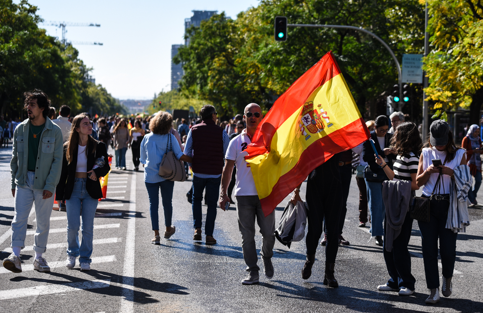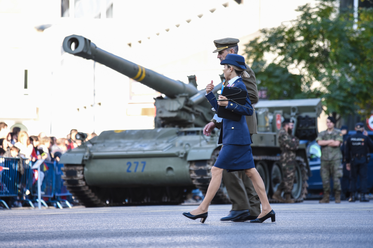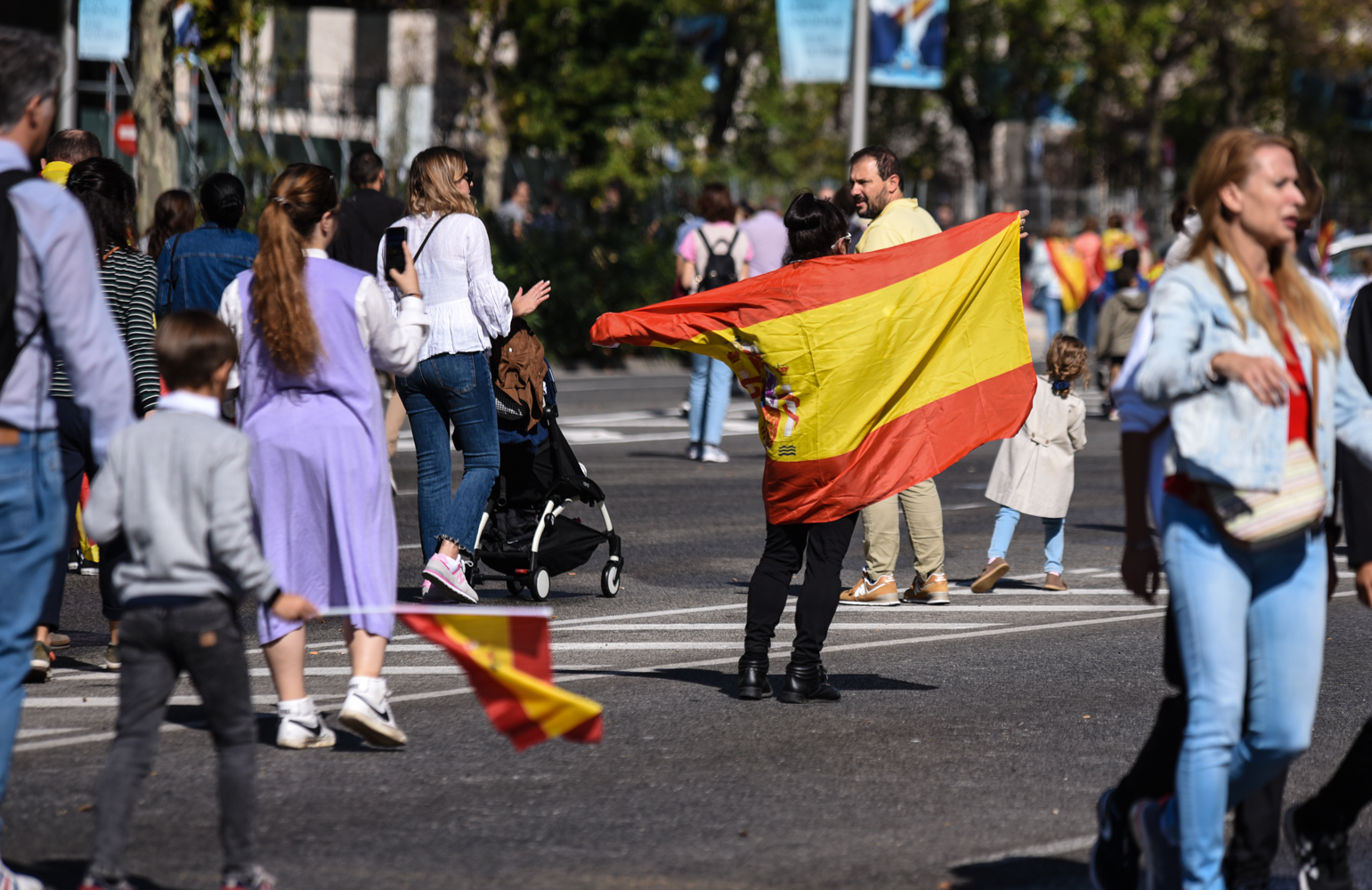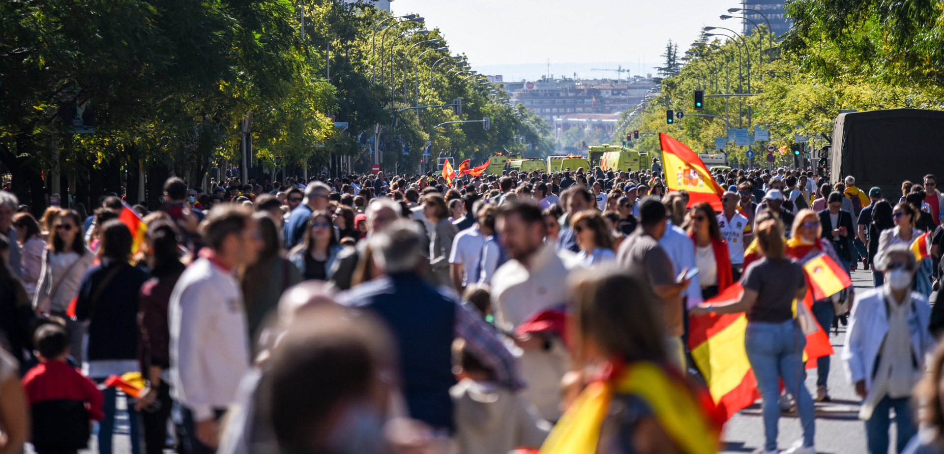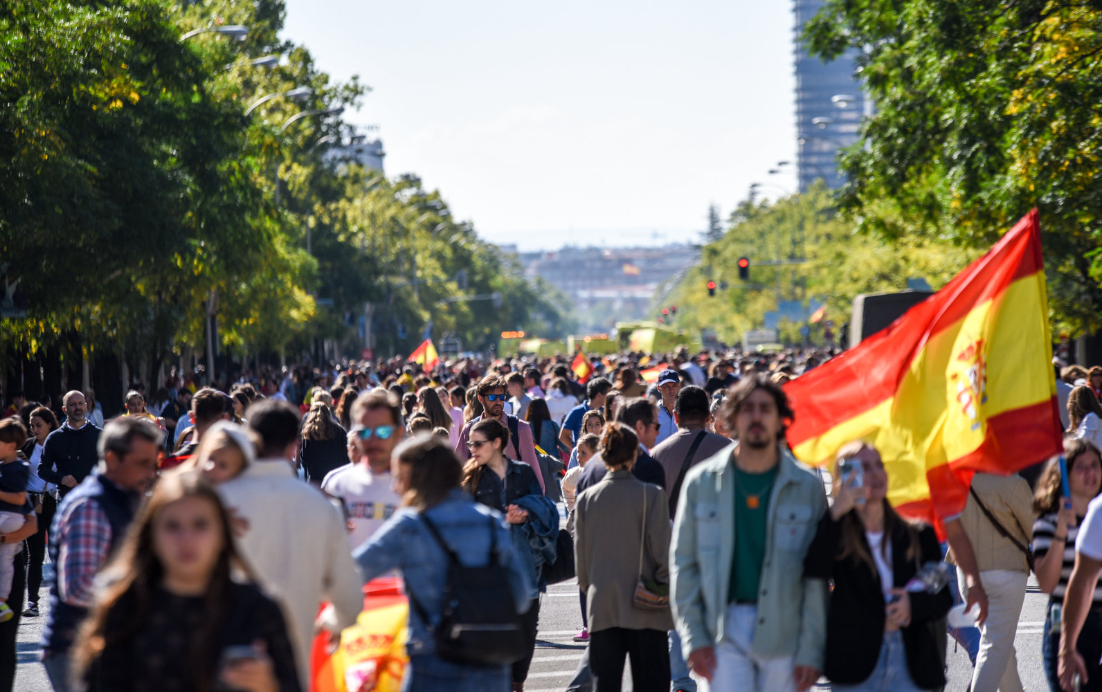 Miles de ciudadanos españoles han acudido, algunos varias horas antes, al centro de la capital para presenciar el desfile militar por el día de la Fiesta Nacional, el primero sin restricciones desde la pandemia.