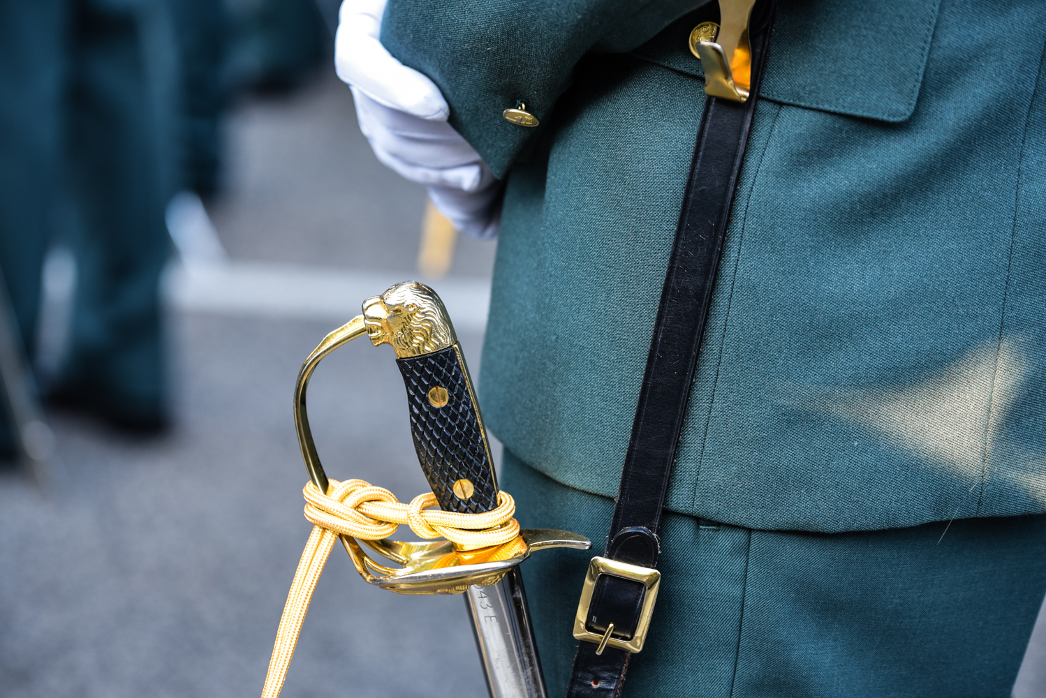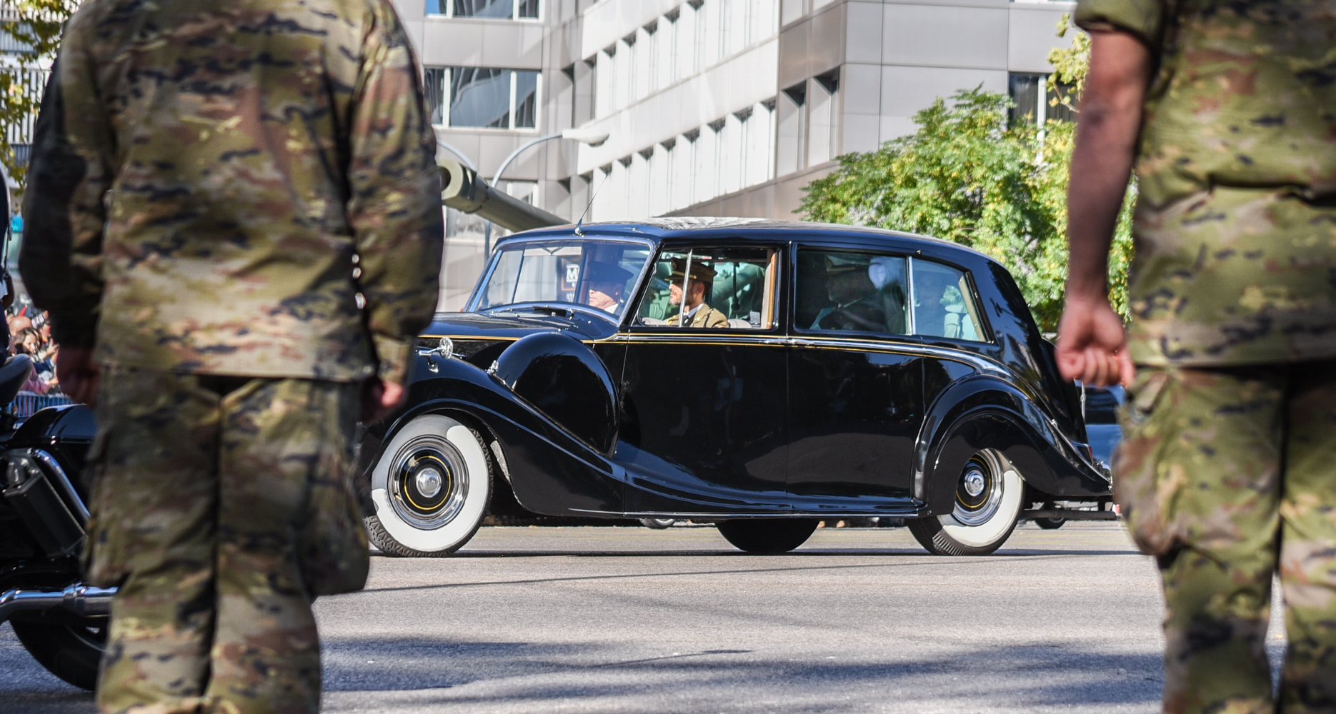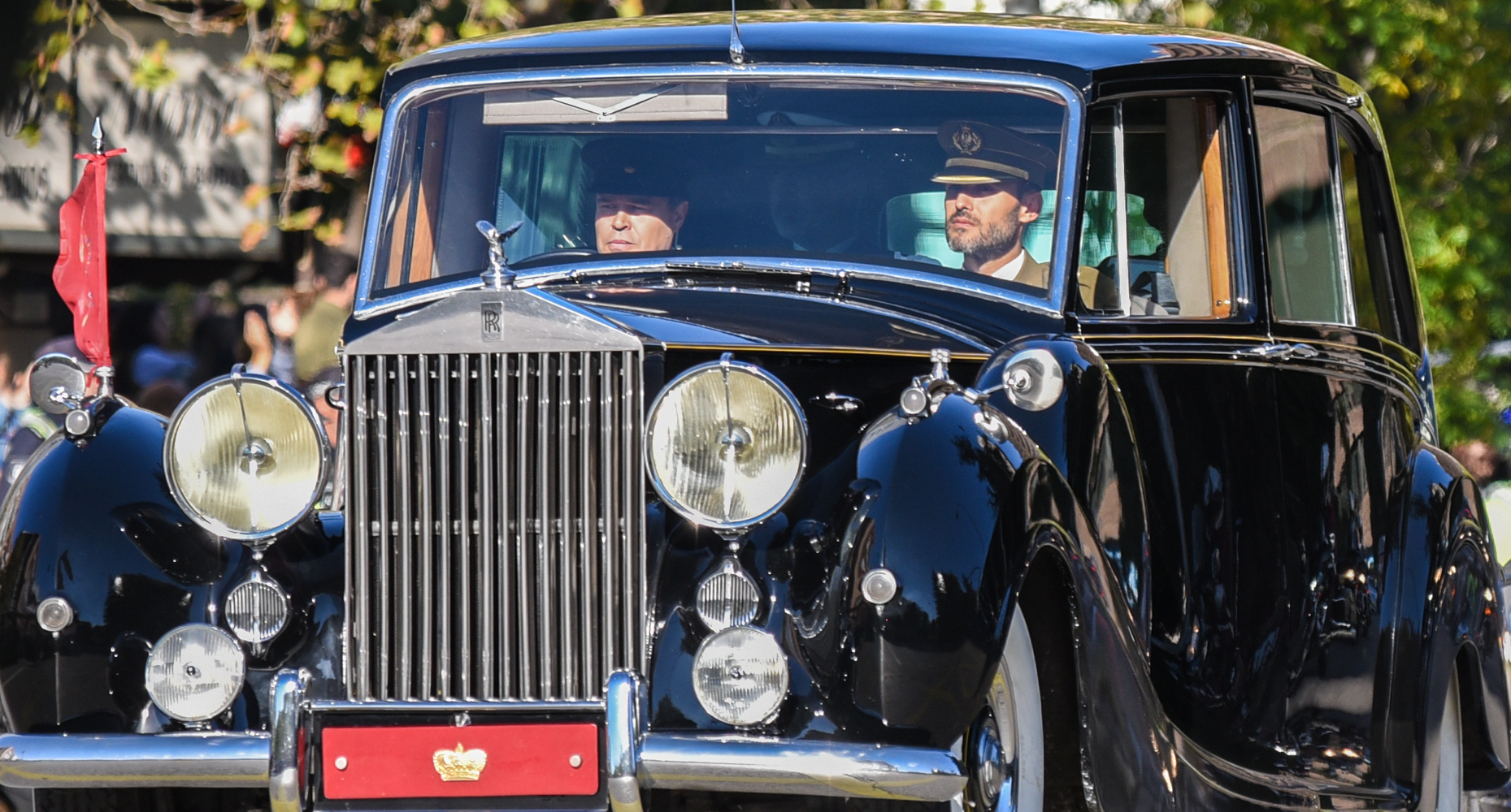 Los soldados, firmes ante la llegada del coche oficial del Rey. En el interior del vehículo en la parte de atrás, Felipe VI y la reina Letizia.