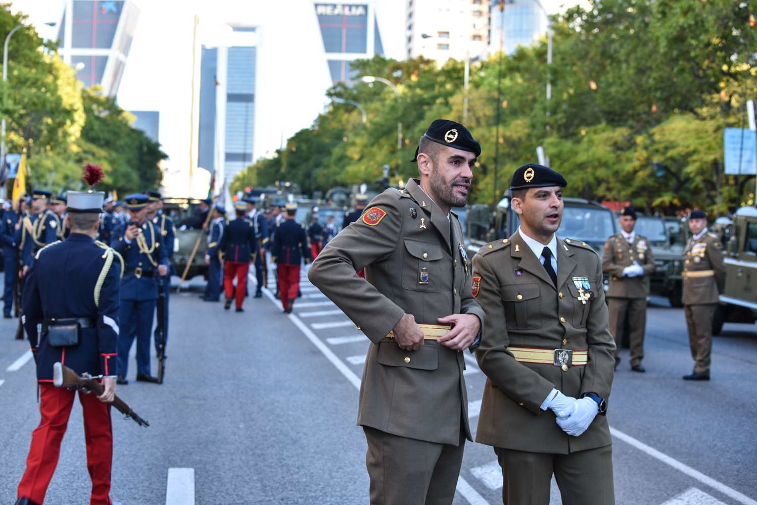 Dos oficiales de los Ejércitos españoles supervisan el recorrido horas antes del comienzo del desfile.
