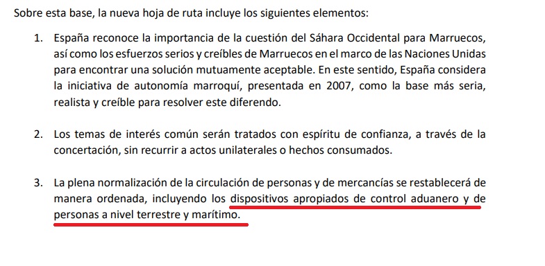 La realidad es que en esa declaración conjunta, tal y como aparece todavía en la página web del Palacio de La Moncloa, no se reconoce en ningún momento la existencia de esas fronteras terrestres o marítimas. El párrafo es tal cual expresa el supuesto alto cargo marroquí pero con una importante en su parte final: "(…) dispositivos apropiados de control aduanero y de personas a nivel terrestre y marítimo". De hecho, el término frontera no aparece en todo el documento.