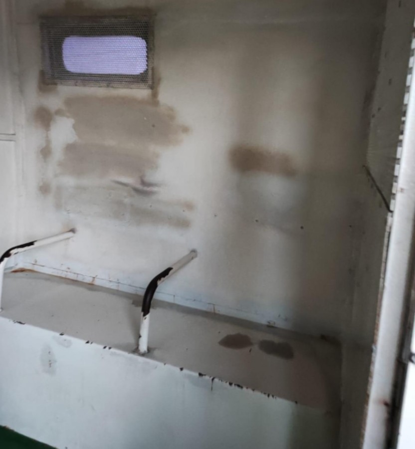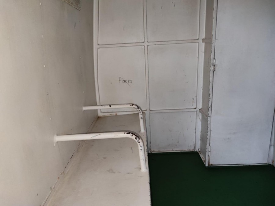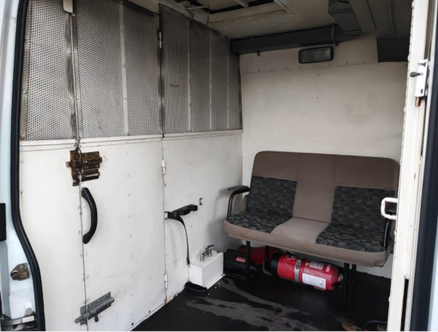 Asientos para los agentes de custodia orientados lateralmente y sin cinturón de seguridad. Se puede observar filtraciones de agua en el suelo.