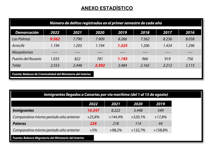 La Confederación Española de Policía (CEP) ha recopilado los datos de criminalidad en las principales plazas canarias en medio del fuerte avance de la llegada de pateras a las islas. Y los resultados son concluyentes. El primer semestre de 2022 ha cerrado con 14.344 delitos. Y el mismo semestre del pasado año 2021 cerró con 12.263. Es decir, que el número de delitos se ha incrementado en 2.081 en medio año, un 17% más.