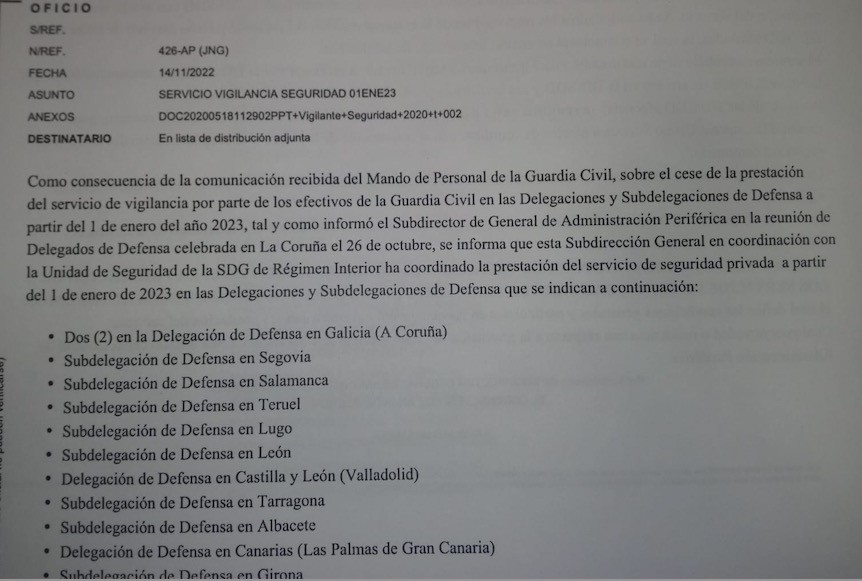 El listado de puestos de vigilancia del que es expulsado el cuerpo de la Guardia Civil es largo: "Dos en la Delegación de Defensa en Galicia (A Coruña); Subdelegación de Defensa en Segovia; Subdelegación de Defensa en Salamanca, Subdelegación de Defensa en Teruel; Subdelegación de Defensa en Lugo; Subdelegación de Defensa en León; Delegación de Defensa en Castilla y León; Subdelegación de Defensa en Tarragona; Subdelegación de Defensa en Albacete; Delegación de Defensa en Canarias (Las Palmas de Gran Canaria); Subdelegación de Defensa en Girona; Subdelegación de Defensa en Huesca; Subdelegación de Defensa en Bilbao; Subdelegación de Defensa en Ávila", señala el propio oficio interno de la Guardia Civil.