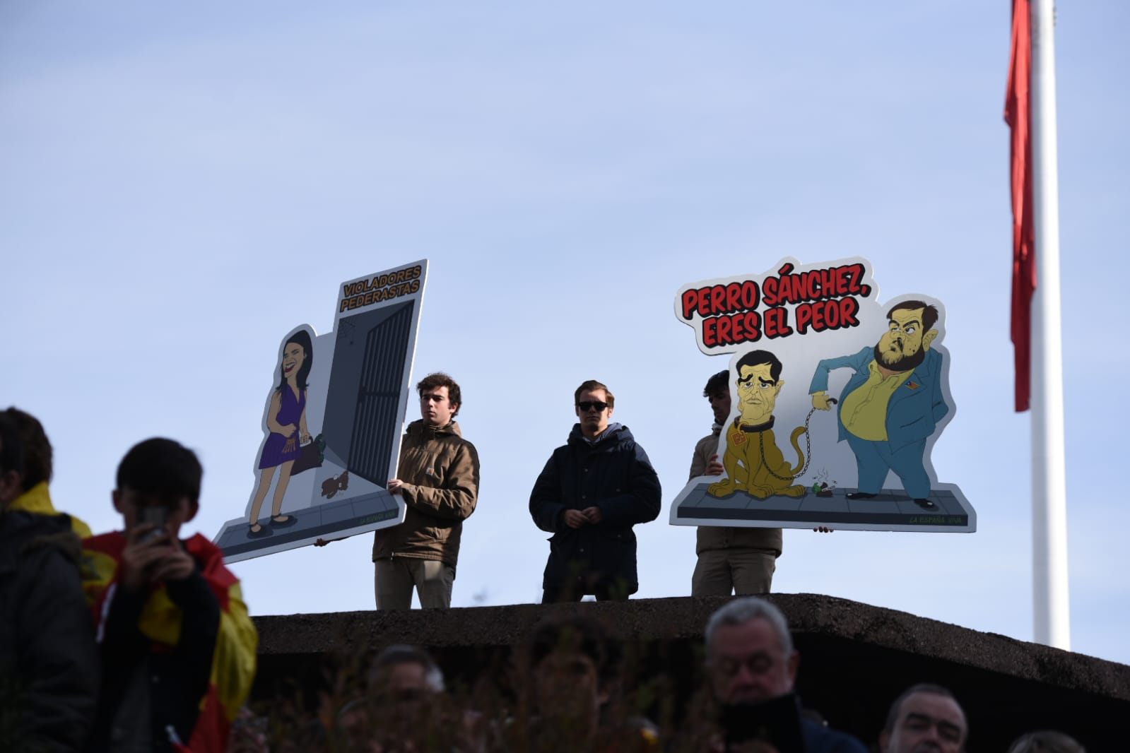 También han podido verse numerosos dibujos ridiculizando su relación con los independentistas, así como caricaturas de la ministra Irene Montero sacando a violadores de prisión.