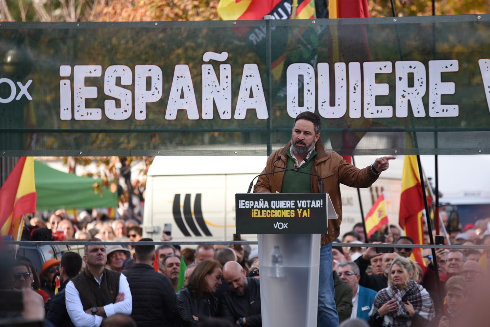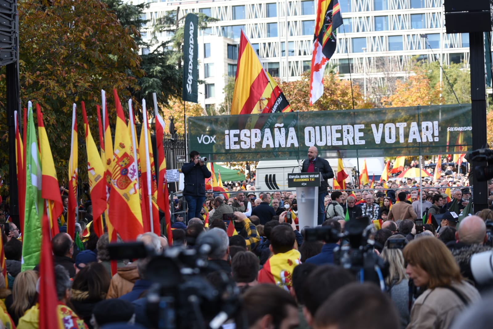 Comienza la intervención de Rodrigo Alonso, secretario general del Sindicato Solidaridad, con el lema “España quiere votar" como telón de fondo.