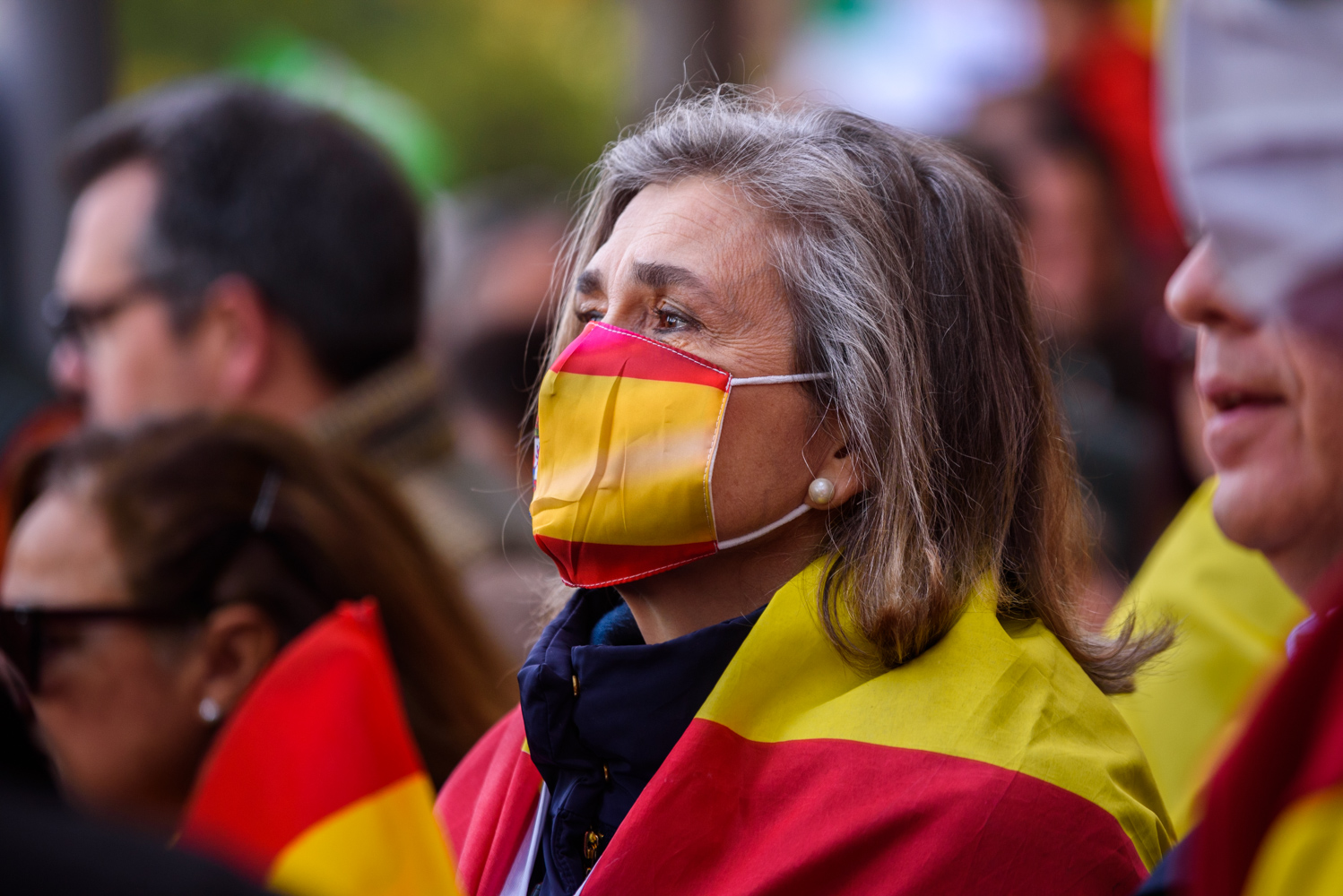 Los asistentes le escuchan ataviados con todo tipo de complementos con la bandera de España.