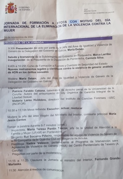 Uno de esos cursos, repleto de cargos de Pedro Sánchez, se impartió el mismo y reciente 24 de noviembre en Pontevedra y contó con la participación de la plana mayor política en materia de género: la subdelegada del Gobierno; la jefa de Igualdad de la Delegación del Gobierno; la jefa de Viogén del Ministerio del Interior y hasta el propio ministro Grande-Marlaska del Gobierno de Sánchez. Y, por si eso era poco, intervino hasta la autora del anteproyecto de la ley del sí es sí.