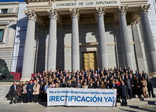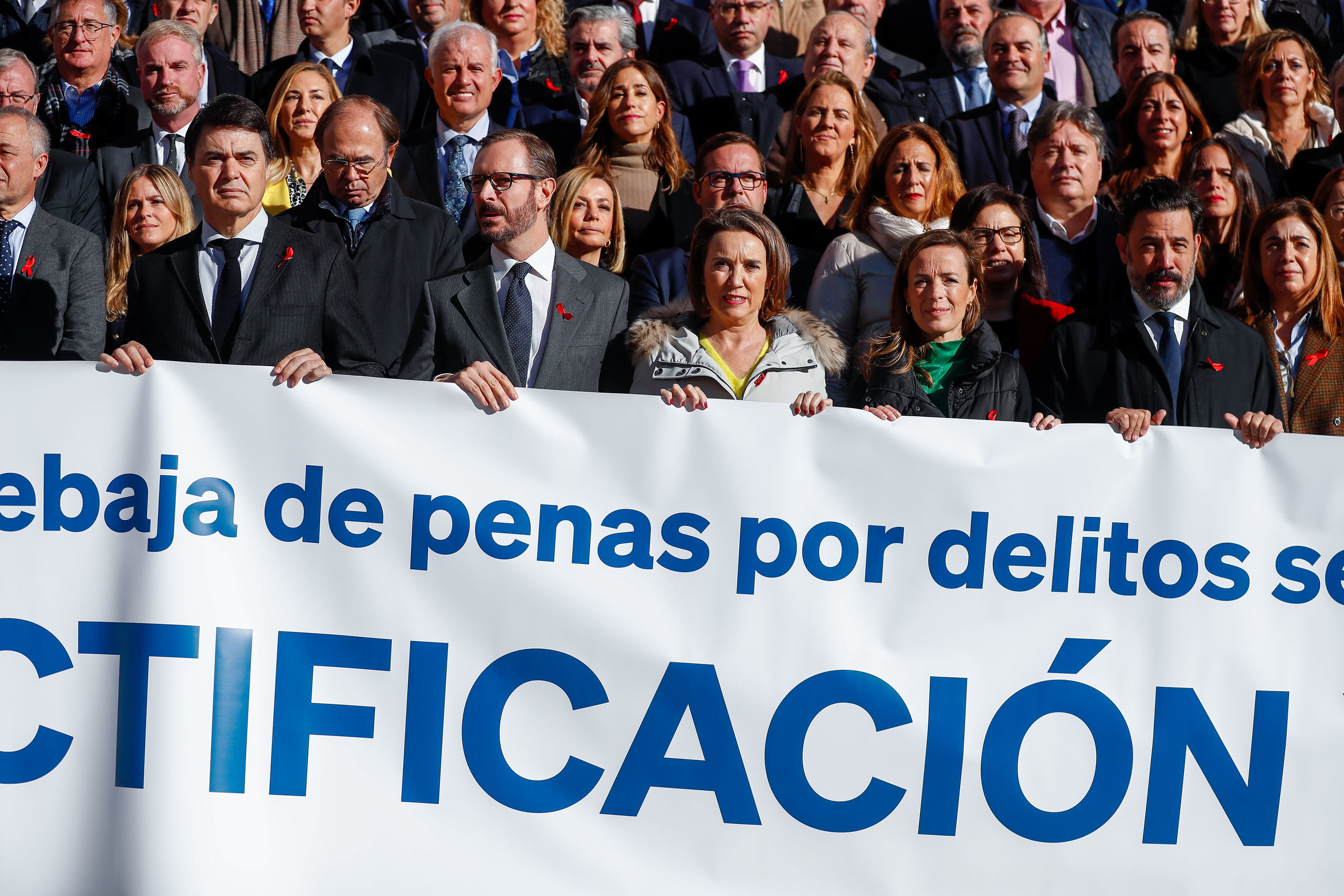A las once de la mañana de este jueves, los diputados del PP y parte de los senadores de la formación se han concentrado tras una pancarta en la que se podía leer: "No a la rebaja de penas por delitos sexuales ¡Rectificación ya!", un mensaje dirigido a la titular de Igualdad a la que han vuelto a pedir su dimisión.