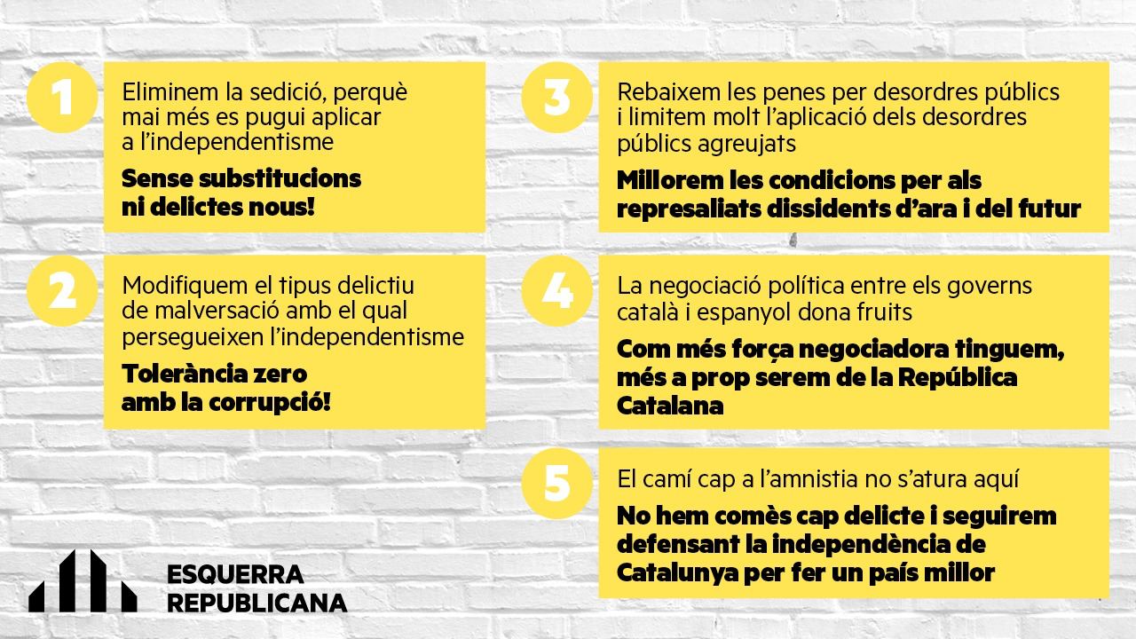 Y el documento de ERC del mes de mayo no deja lugar a dudas. Recoge un mandato principal: "Indulto a los presos políticos catalanes" y retirada de "los procedimientos de extradición contra los políticos catalanes que residen en el exilio por organizar el referéndum y otras manifestaciones masivas". A esas reclamaciones le suma la exigencia de que "retire todos los procesos penales, incluidos los relativos a funcionarios de menor rango involucrados con el referéndum de 2017 y se abstenga de sancionar a los políticos sucesores de los presos políticos por acciones simbólicas que meramente expresaban solidaridad con aquellos en prisión".