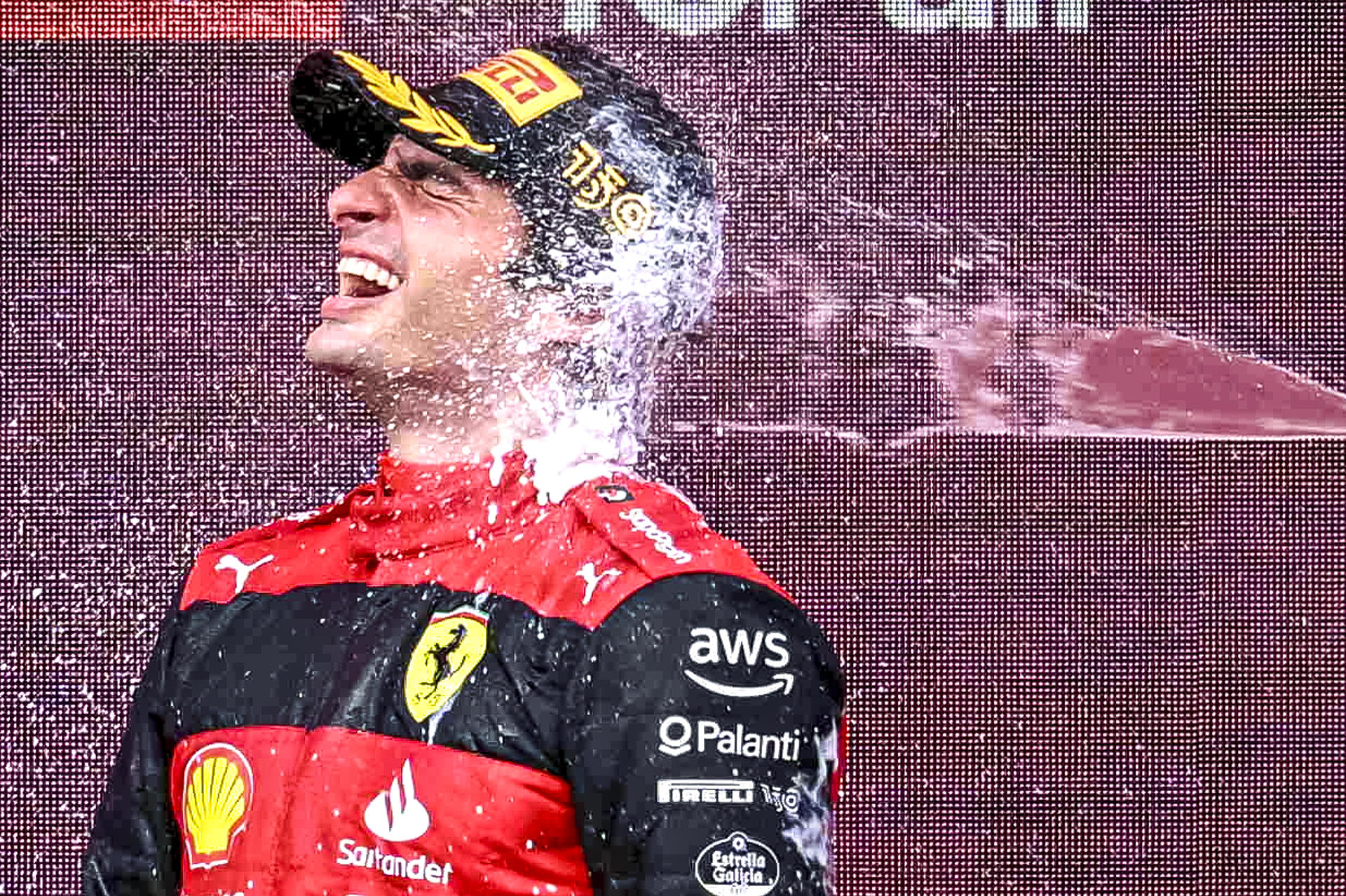 El piloto español Carlos Sáinz, de la escudería Ferrari, celebra en el podio su victoria en el Gran Premio Británico de Fórmula Uno, disputado el 3 de julio en el circuito de Silverstone. El madrileño ha acabado el año con la vista puesta en ganar el Mundial de 2023.