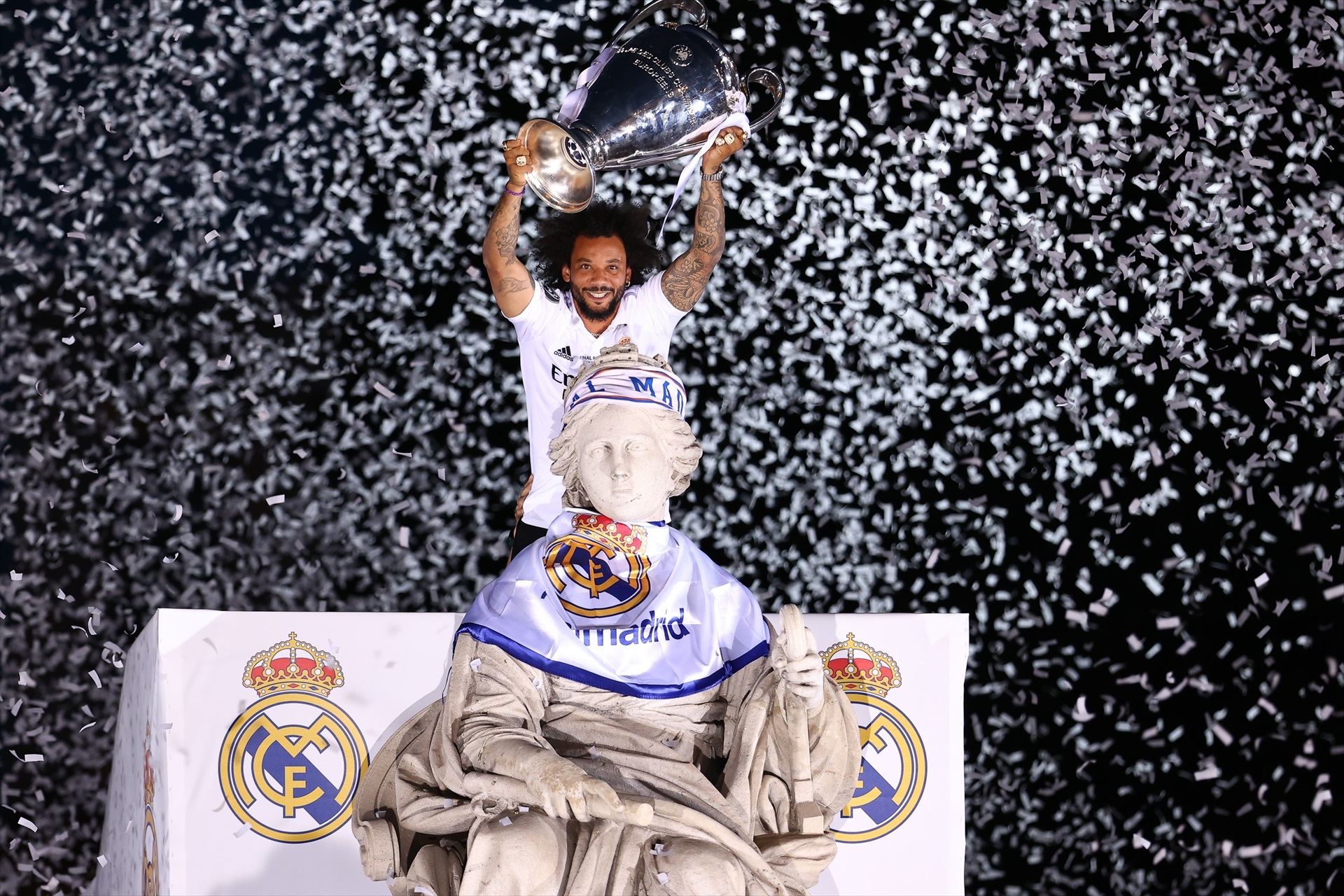 Marcelo Vieira Da Silva celebra el 14º título de la Liga de Campeones del Real Madrid -tras vencer al Liverpool FC- el 29 de mayo, en la fuente Cibeles.
