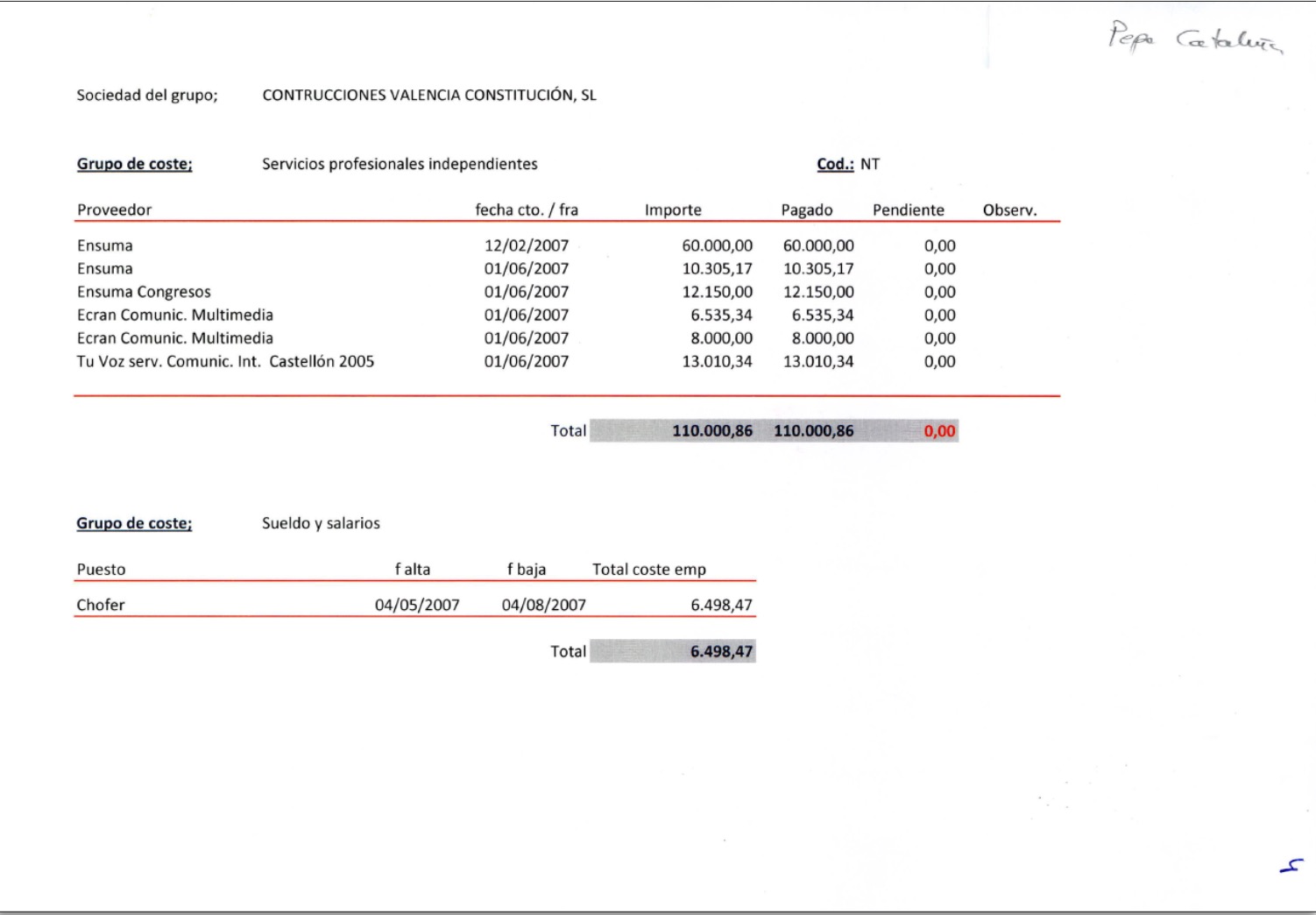 Se trata de un documento clave, tal y como se puede comprobar en la imagen que se adjunta a este artículo. Un documento con inscripciones manuscritas, donde aparece el nombre del extesorero del PSOE-PSPV con el nombre completo: "Pepe Cataluña". Hay que recordar que la gran campaña socialista para acabar derribando el Gobierno del PP vigente hasta 2018 surgió tras aparecer este tipo de anotaciones manuscritas con nombres detallados con siglas o con pseudónimos en papeles similares o menos representativos que el que hoy publica Libertad Digital.