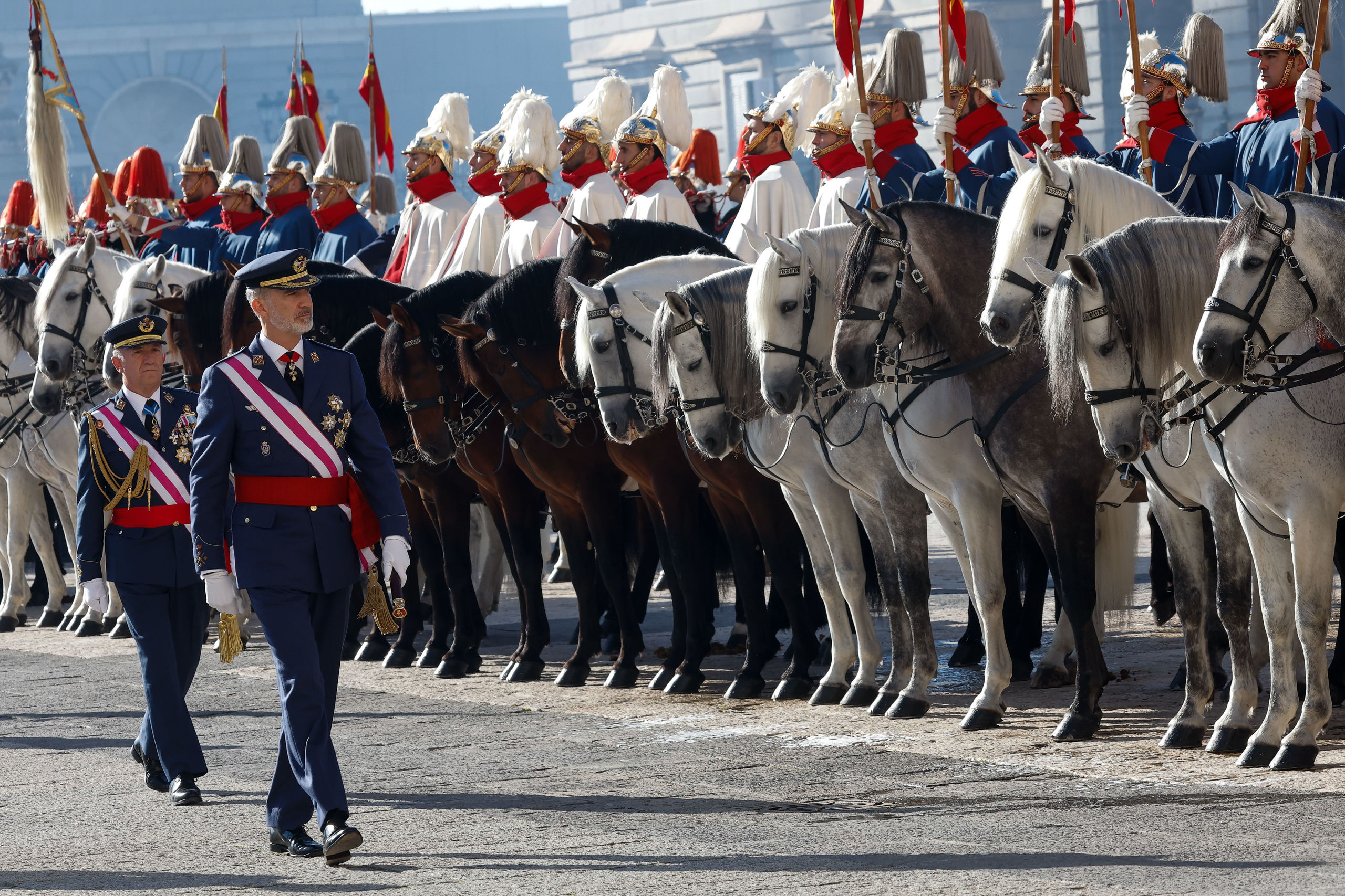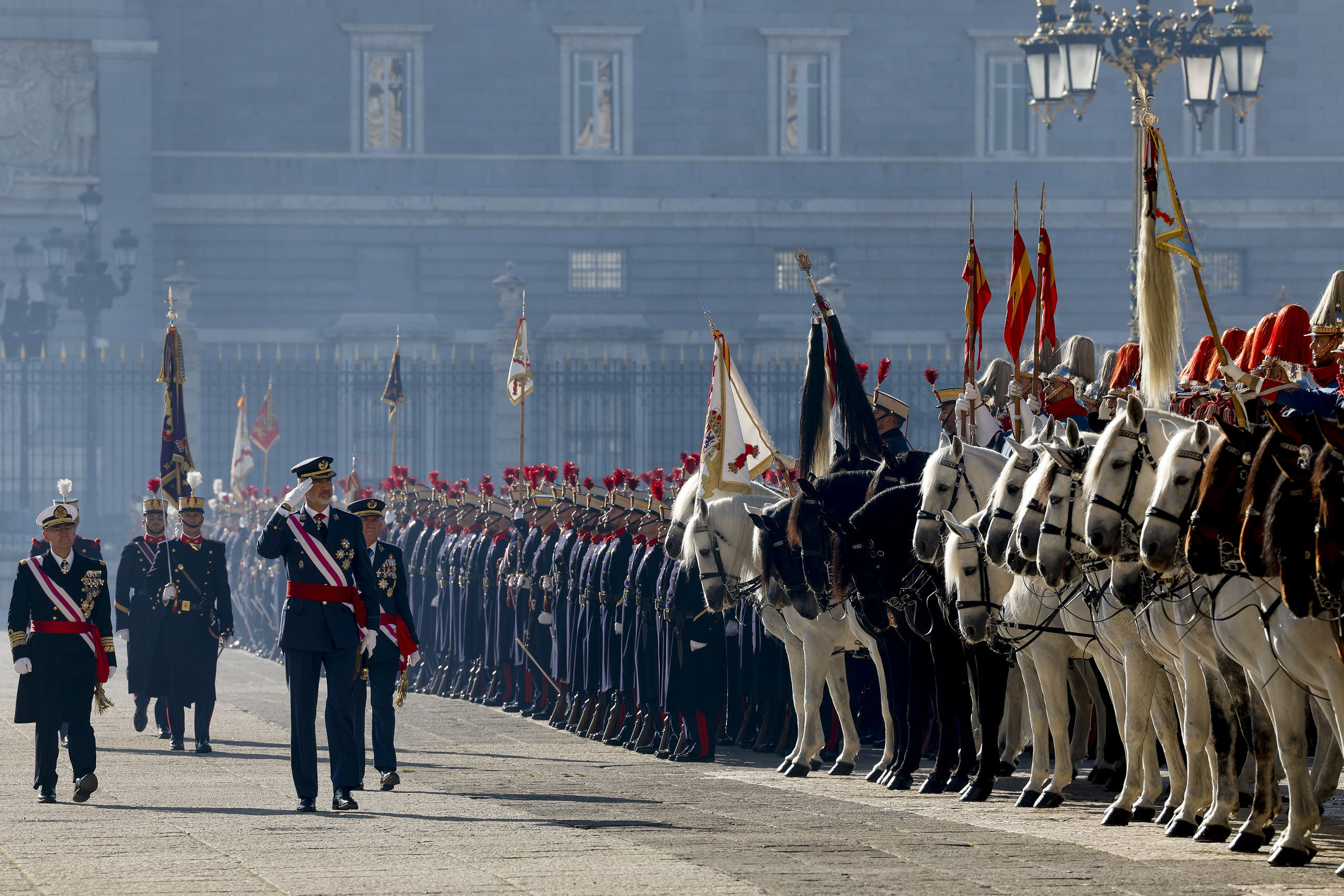 El rey Felipe VI pasa revista a las tropas durante la celebración de la Pascua Militar este viernes en la plaza de la Armería de Madrid, frente al Palacio Real.