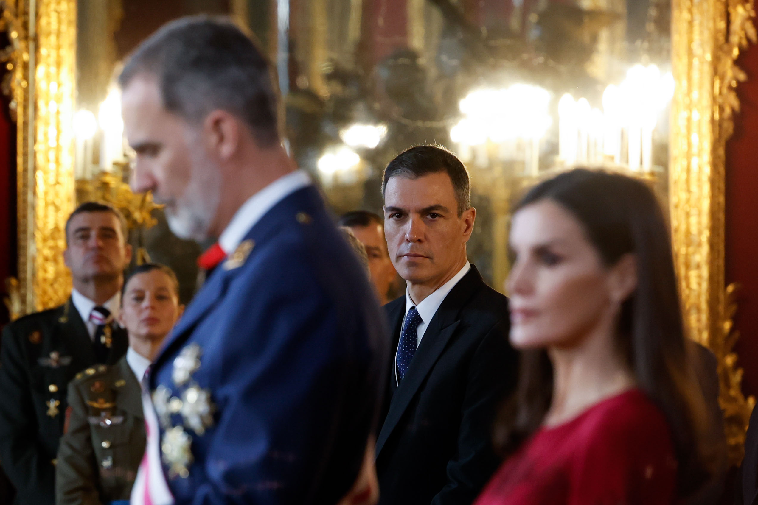 El presidente del Gobierno, Pedro Sánchez (C), escucha la intervención del rey Felipe VI (i), ante la reina Letizia, durante la celebración de la Pascua Militar este viernes en el Palacio Real de Madrid.