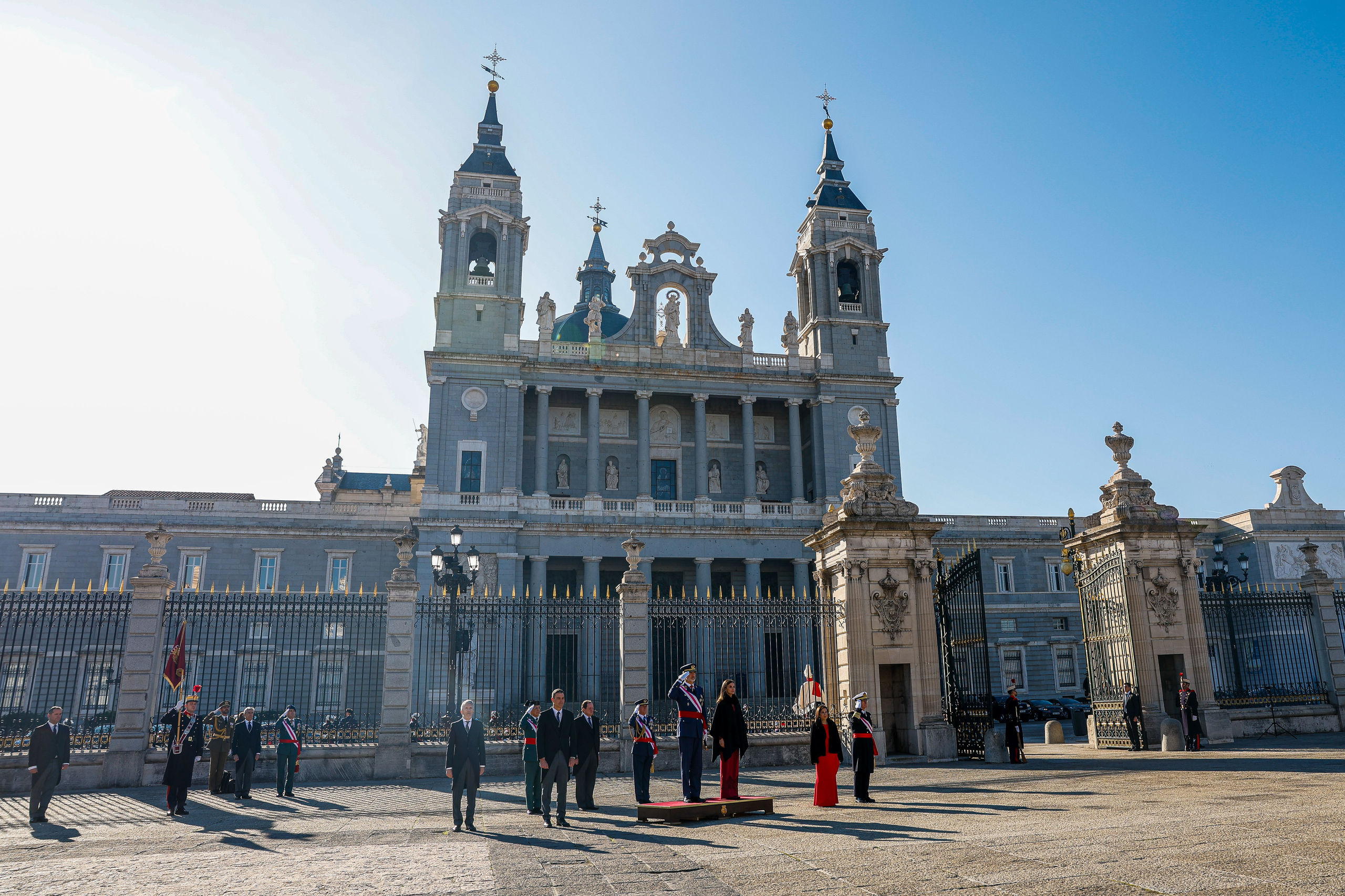 El rey Felipe VI (2d) preside la celebración de la Pascua Militar este viernes en la plaza de la Armería de Madrid, frente al Palacio Real, acompañado por la reina Letizia, el presidente del gobierno, Pedro Sánchez (2i, delante) y el ministro del Interior, Fernando Grande-Marlaska (i).