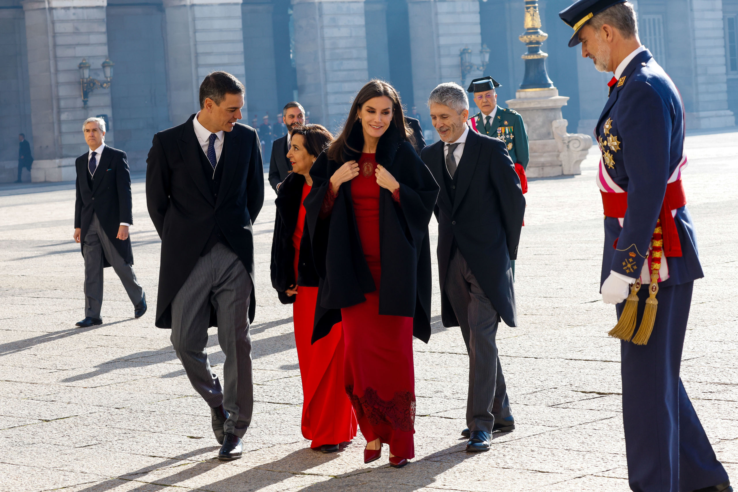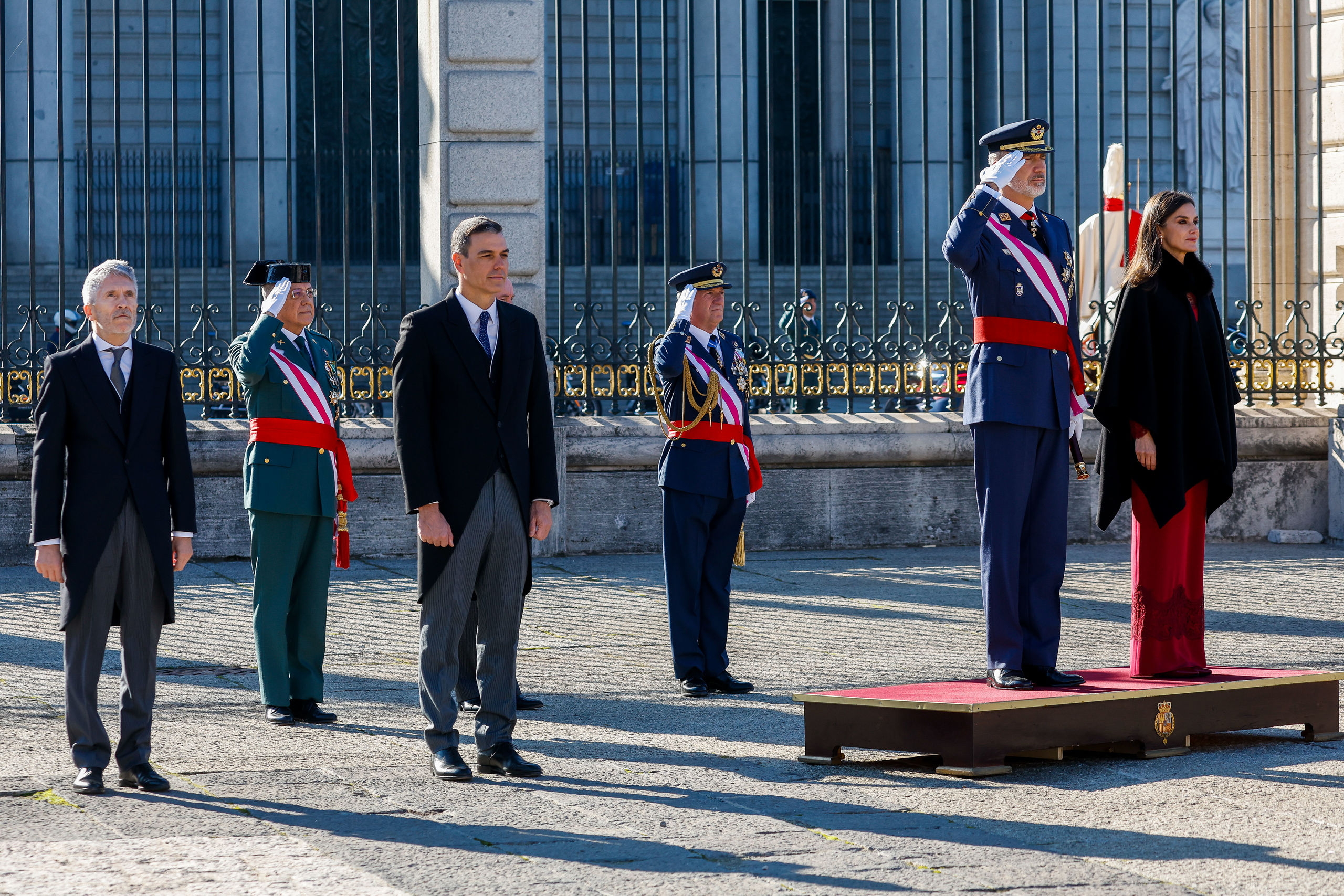 El rey Felipe VI (d) preside la celebración de la Pascua Militar este viernes en la plaza de la Armería de Madrid, frente al Palacio Real, acompañado por la reina Letizia (3d), la ministra de Defensa, Margarita Robles (4d), el presidente del gobierno, Pedro Sánchez (5d) y el ministro del Interior, Fernando Grande-Marlaska (2d).