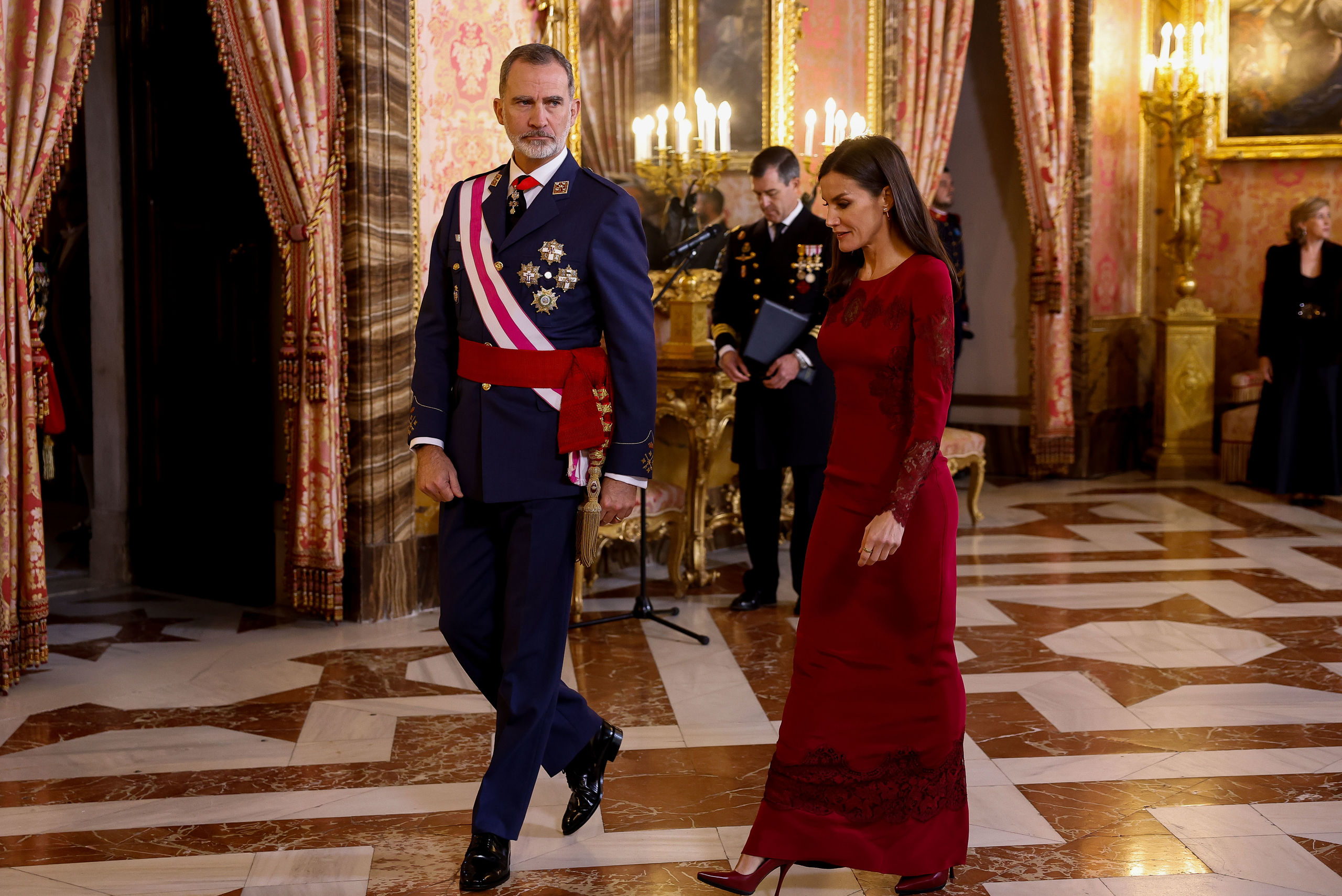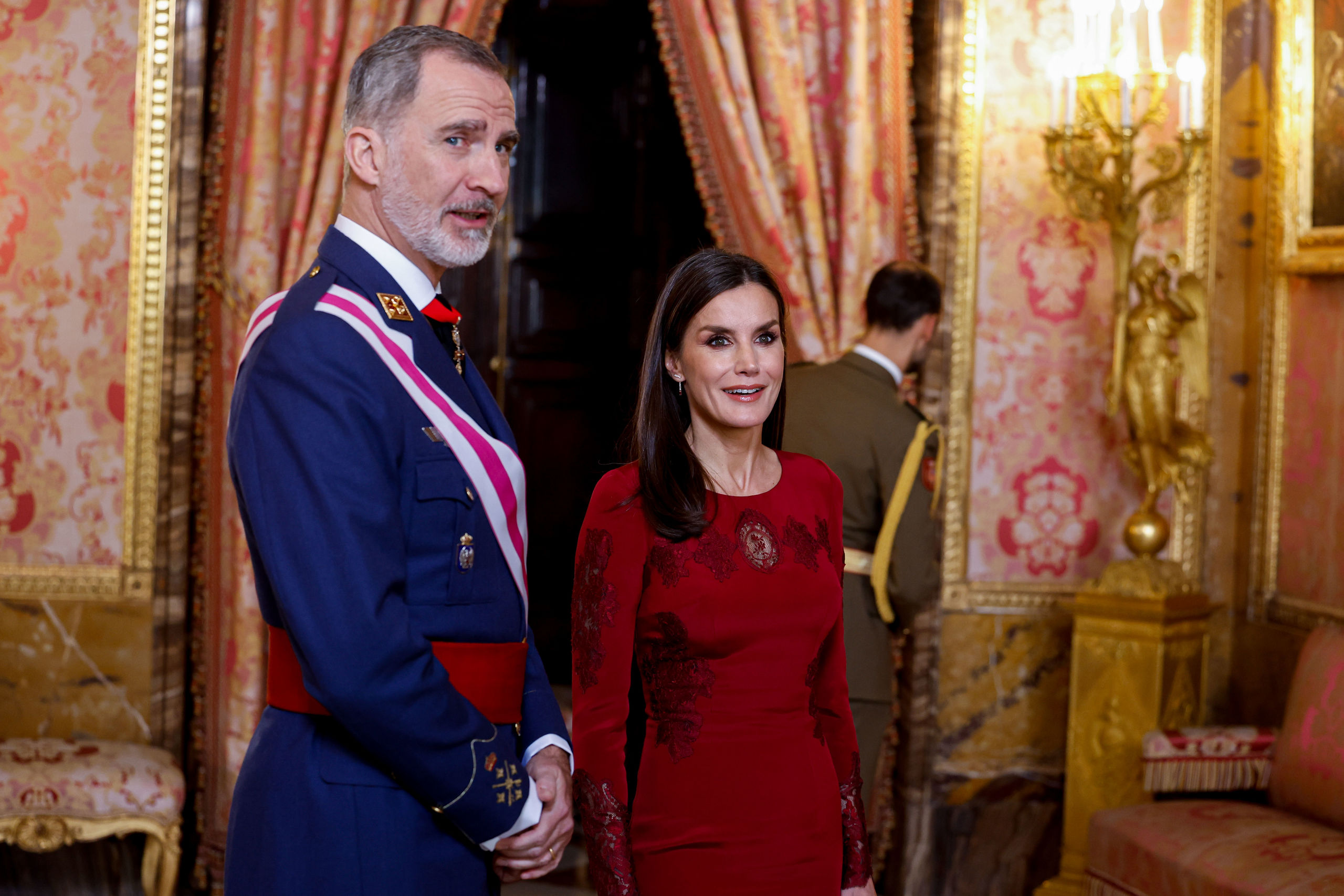 El rey Felipe VI y la reina Letizia, durante la recepción a autoridades con motivo de la celebración de la Pascua Militar este viernes en el Palacio Real de Madrid.