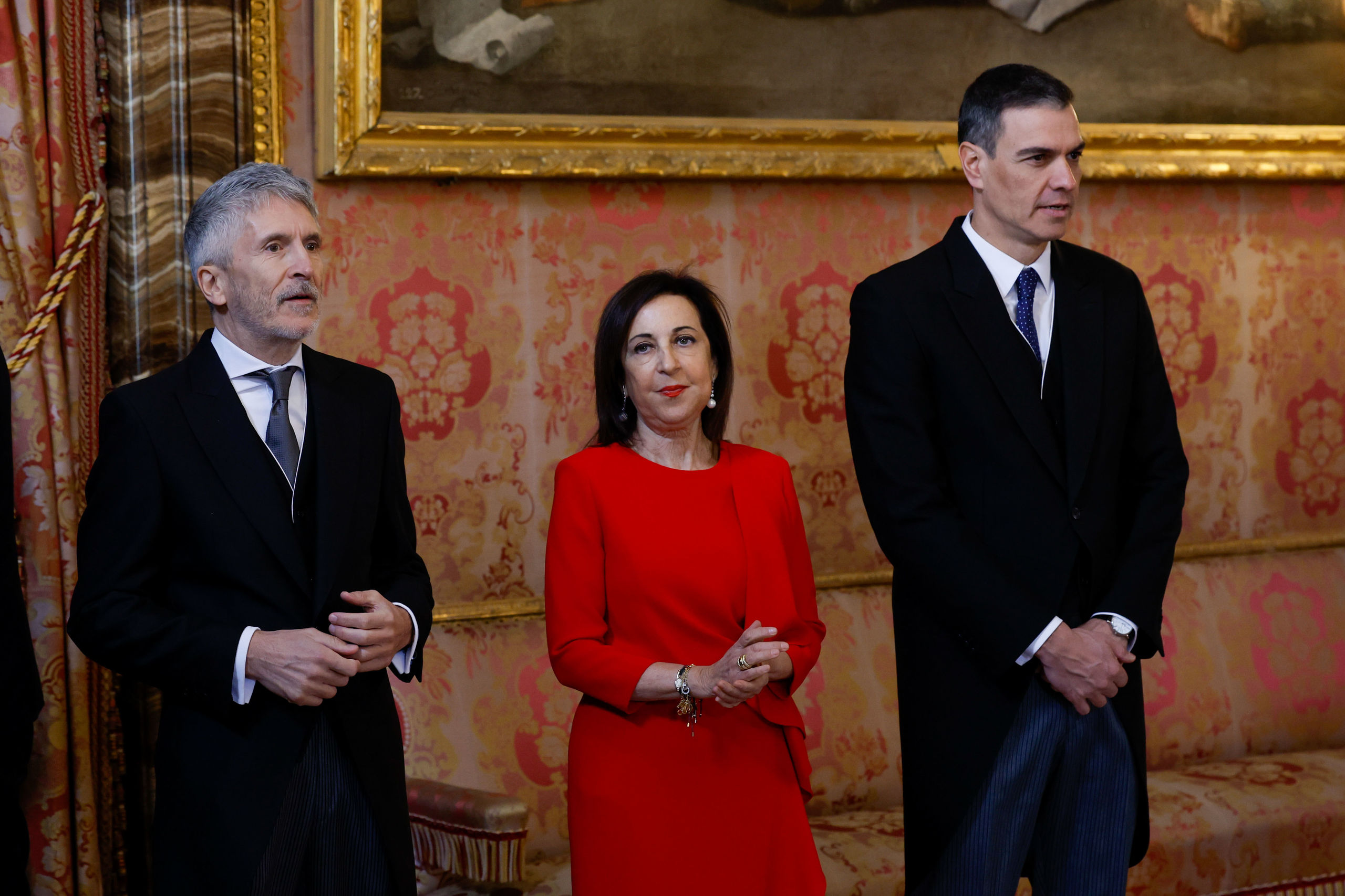 El presidente del gobierno, Pedro Sánchez (d), la ministra de Defensa, Margarita Robles, y el ministro del Interior, Fernando Grande-Marlaska, durante la recepción a autoridades por parte del rey Felipe VI y la reina Letizia con motivo de la celebración de la Pascua Militar este viernes en el Palacio Real de Madrid.