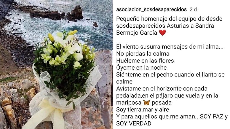 El papel de la asociación SOS Desaparecidos -con más de doce años de trayectoria- ha sido muy importante, tanto en la investigación de los hechos como en el acompañamiento a los familiares de Sandra durante todo el proceso. La delegación de Asturias también quiso participar en la despedida de la joven, a la que rindieron homenaje de manera simultánea. Mientras se celebraba el acto en Madrid, ellos guardaron un minuto de silencio y dejaron un ramo de flores en el lugar donde se encontró su cuerpo.