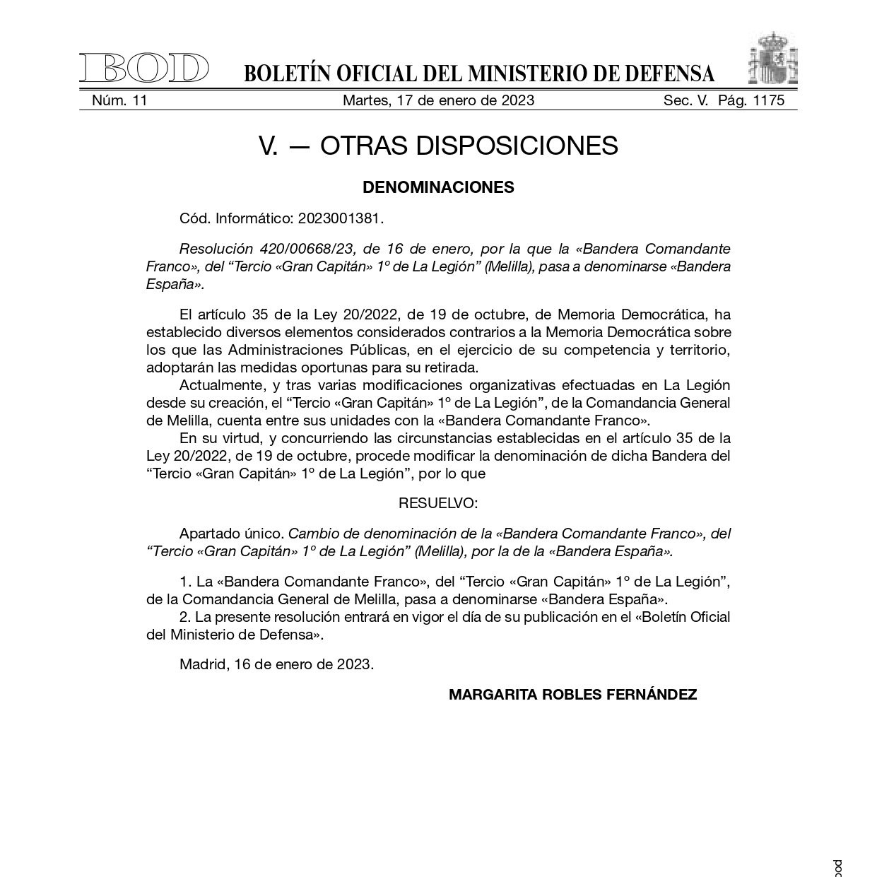 Este martes ha aparecido publicada en el Boletín Oficial de Defensa (BOD) una resolución, que firma la ministra de Defensa, Margarita Robles, con fecha de este lunes, en la que se fulmina ese homenaje interno a su labor en la unidad y se renombra la misma: "la Bandera Comandante Franco, del Tercio Gran Capitán número 1 de La Legión (Melilla), pasa a denominarse Bandera España". El cambio se hace efectivo de manera inmediata.